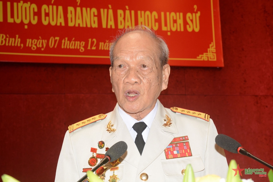 Thượng tướng Lê Huy Vịnh, Ủy viên Trung ương Đảng, Thứ trưởng Bộ Quốc phòng phát biểu tại hội thảo.