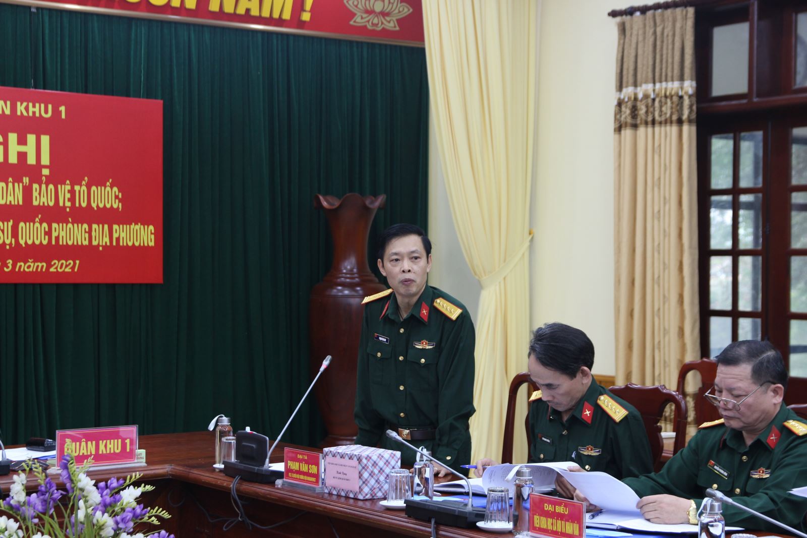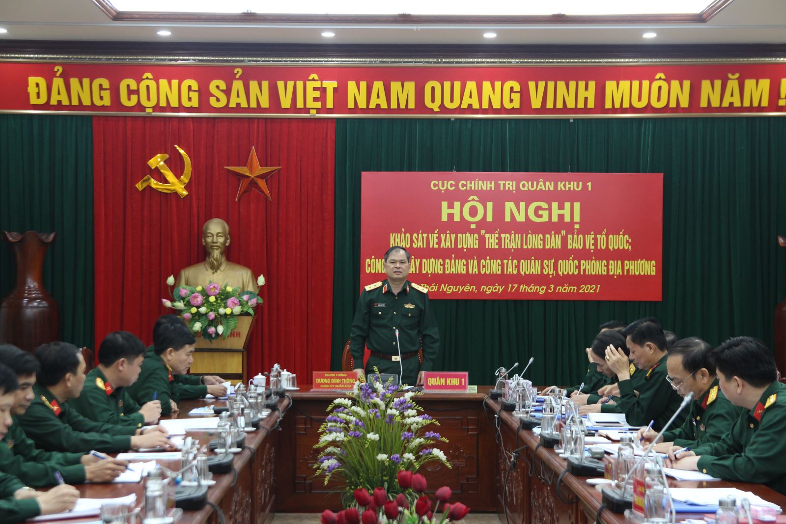 Chiều 17-3, Viện Khoa học xã hội và nhân văn (Học viện Chính trị) phối hợp với Quân khu tổ chức Hội nghị khảo sát về xây dựng “thế trận lòng dân” bảo vệ Tổ quốc; công tác xây dựng Đảng và công tác quân sự, quốc phòng địa phương. Trung tướng Dương Đình Thông, Bí thư Đảng ủy, Chính ủy Quân khu khu dự và phát biểu tại hội nghị.