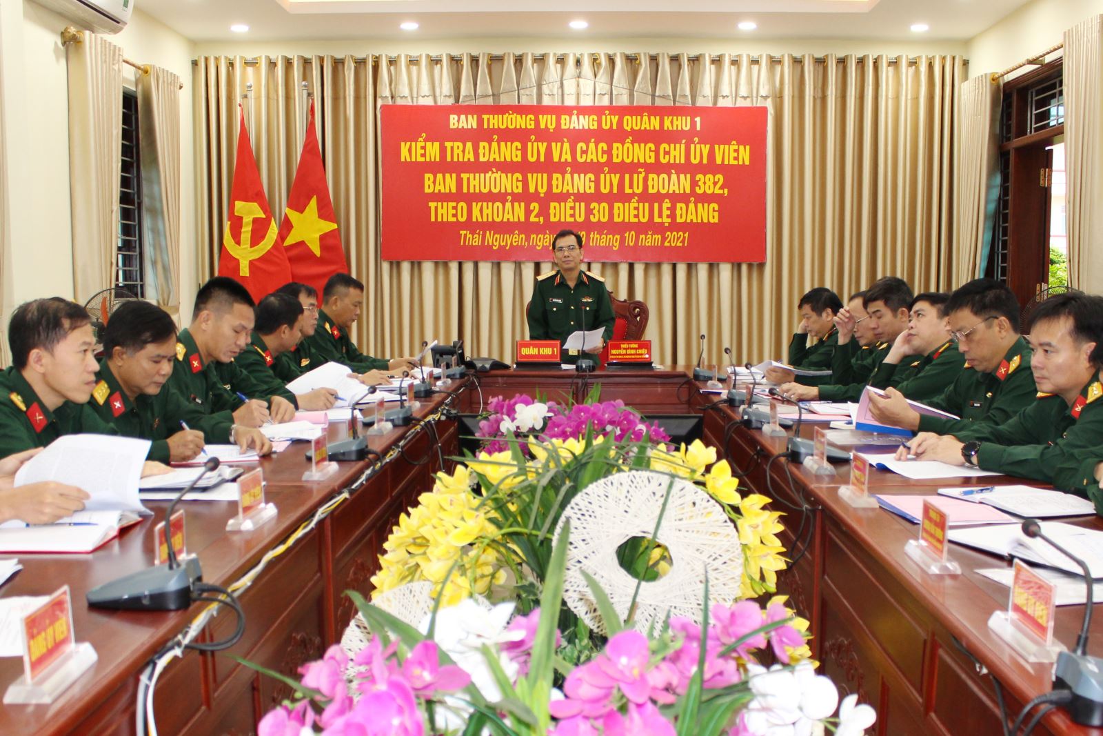 Qua làm việc trực tiếp với các tổ chức đảng trực thuộc Đảng ủy Lữ đoàn; dự sinh hoạt, nghe các đồng chí Ủy viên Ban Thường vụ Đảng ủy Lữ đoàn 382 báo cáo tự kiểm điểm. Đoàn kiểm tra nhận xét: Đảng ủy Lữ đoàn 382 đã quán triệt, thực hiện nghiêm túc nghị quyết, chỉ thị, quy định của Đảng; nhất là của Đảng ủy Quân khu về nhiệm vụ QS, QP hằng năm. Lãnh đạo, chỉ đạo duy trì nghiêm chế độ SSCĐ, luyện tập thường xuyên các phương án tác chiến; có nhiều giải pháp toàn diện trong nâng cao chất lượng huấn luyện, diễn tập, hội thi, hội thao các cấp đạt kết quả cao, an toàn tuyệt đối.
