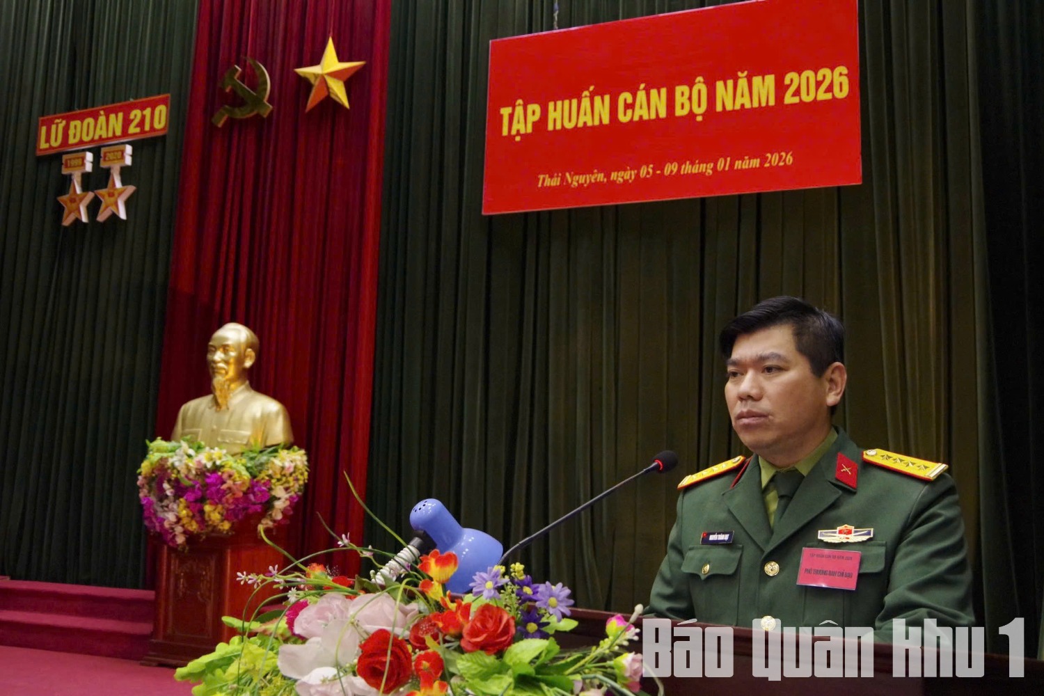 Lớp tập huấn diễn ra trong 5 ngày, từ 5 đến 9-1, tập trung vào các nội dung: Quán triệt một số văn bản Chỉ thị, Nghị quyết của Quân khu; Quy trình sử dụng thuốc nổ, hỏa cụ, thiết bị và thực bảnh tượng trưng tạo giả trong diễn tập; công tác ngụy trang, nghi trang; Đội ngũ Tổ Quân kỳ; Đội ngũ đơn vị (theo biên chế mới); Nội dung, chương trình huấn luyện và tiêu chuẩn rèn luyện thể lục cho các đối tượng. Thống nhất công tác tổ chức chỉ huy và bảo đảm an toàn trong huấn luyện, kiểm tra, hội thi, hội thao một số môn thể thao quân sự ở cơ sở; Huấn luyện bắn súng STV 380; Tính năng, tác dụng, cấu tạo, cách sử dụng khí tài phòng da PD-2; tiểu đội phòng hóa kiêm nghiệm luyện tập mang mặc khí tài phòng da, khí tài phổ thông; Thứ tự, nội dung của Bí thư cơ quan, Chính trị viên đại đội trong diễn tập chuyển trạng thái sẵn sàng chiến đấu; Nắm tình hình, giám sát thường xuyên đối với tổ chức Đảng, đảng viên; Nội dung, quy trình tiến hành công tác tư tưởng quân nhân, nắm và định hướng dư luận trong Lữ đoàn; lan tỏa người tôt, việc tốt trên trang “Trận địa hoa sim”, “Rồng lửa Thái Nguyên”; Ảnh hưởng của rượu, bia đoi với sức khỏe quân nhân. Một số giải pháp bảo đảm trật tự an toàn giao thông năm 2026 và những năm tiếp theo;
