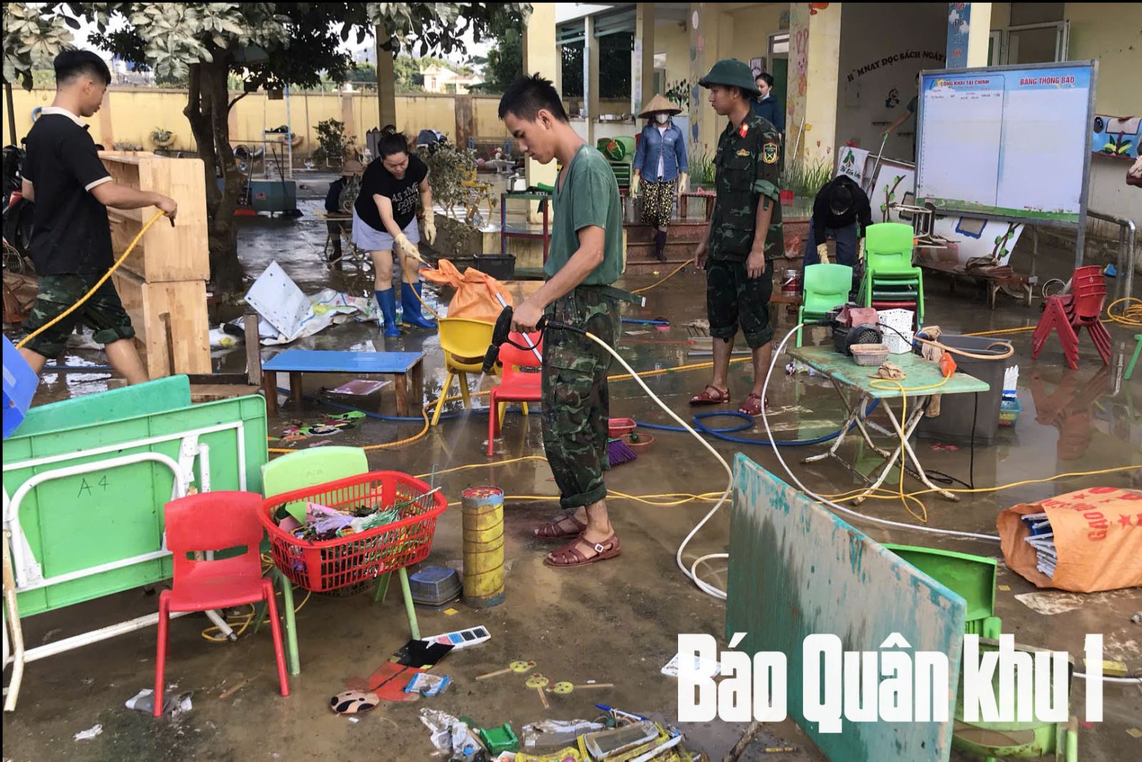 Ngay sau khi lũ rút, cán bộ, chiến sĩ Lữ đoàn 601 chung sức giúp các trường học trên địa bàn dọn dẹp vệ sinh, khôi phục hoạt động dạy và học.