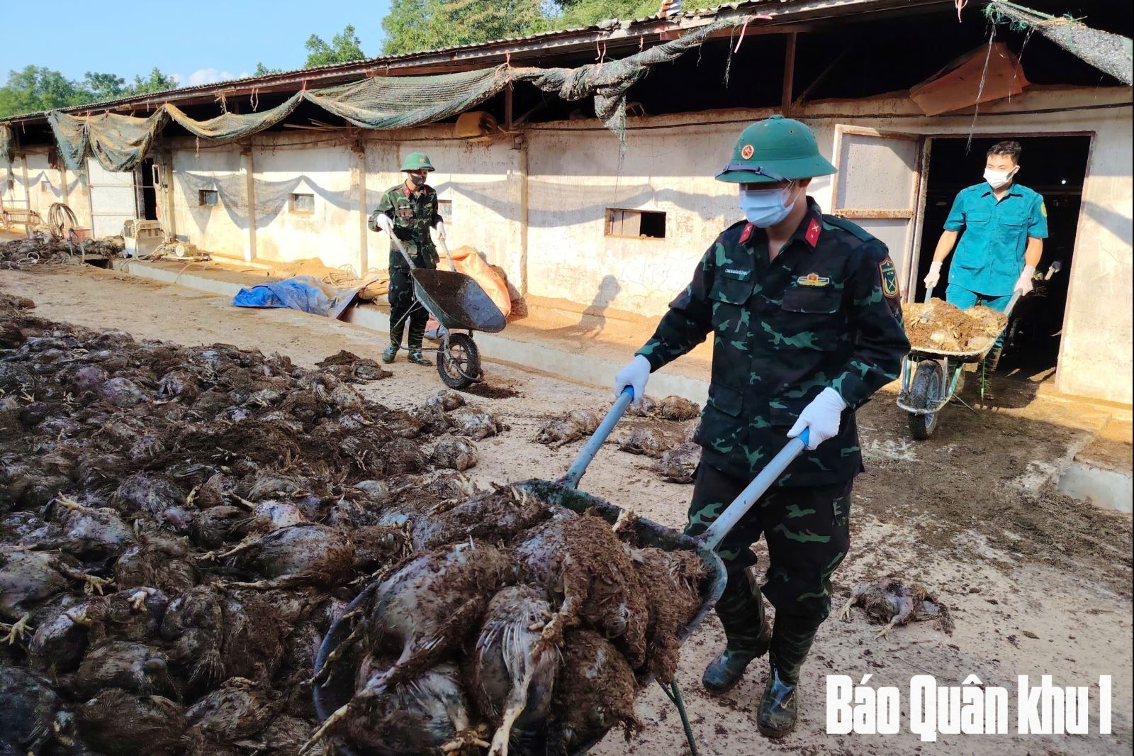 Cán bộ, chiến sĩ giúp nhân dân xóm 4, xã Đồng Hỷ thu dọn, tiêu hủy xác gia cầm, giữ gìn vệ sinh môi trường sau lũ.