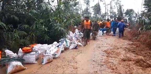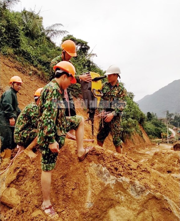 Các lực lượng tích cực san lấp đất đá, thông đường 71.