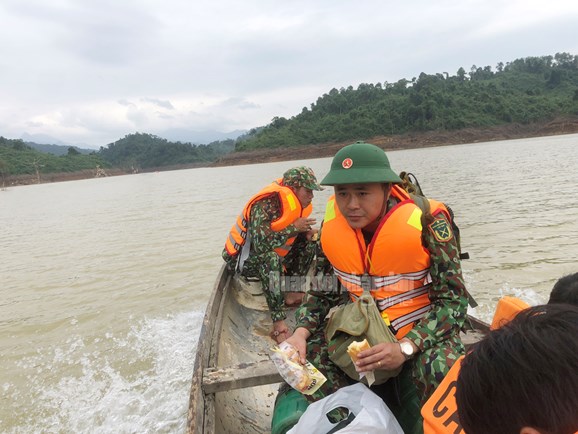 Cán bộ, chiến sĩ Đại đội 18 Bộ CHQS Thừa Thiên-Huế, bộ phận đảm bảo thông tin - tranh thủ dùng bữa trưa trên xuồng vào Rào Trăng 3.