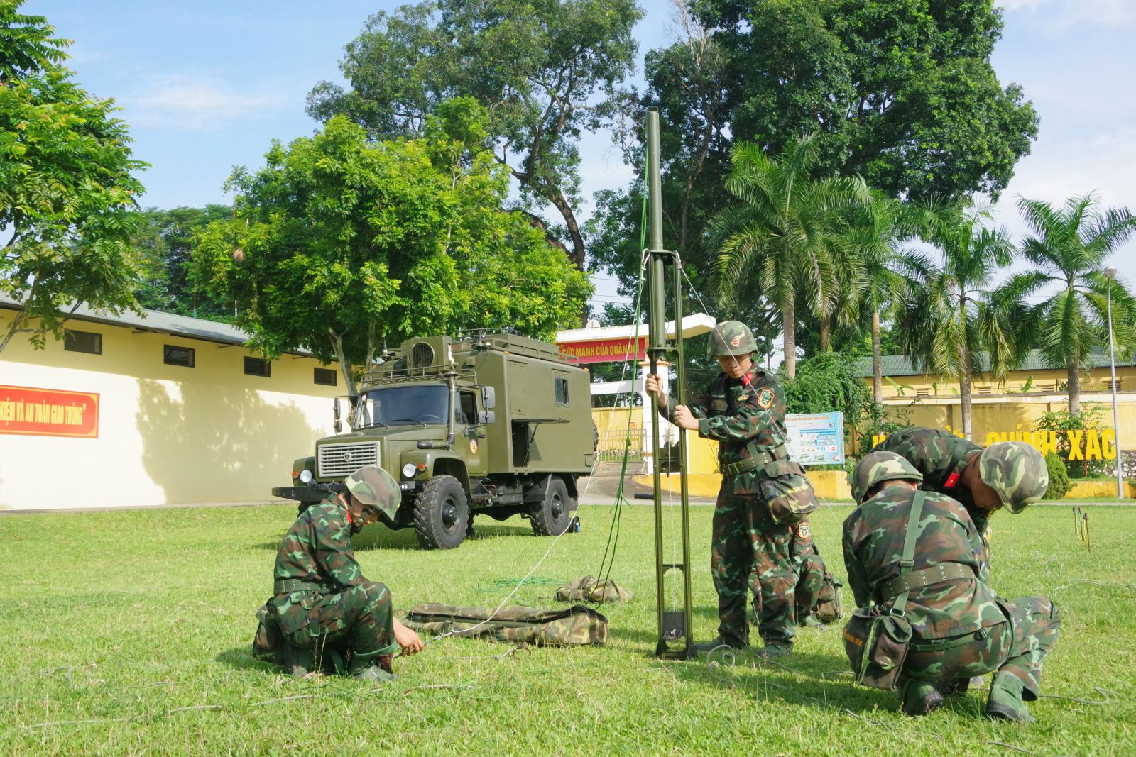 Cán bộ, chiến sĩ Lữ đoàn tham gia luyện tập triển khai hệ thống thông tin liên lạc phục vụ sẵn sàng chiến đấu.