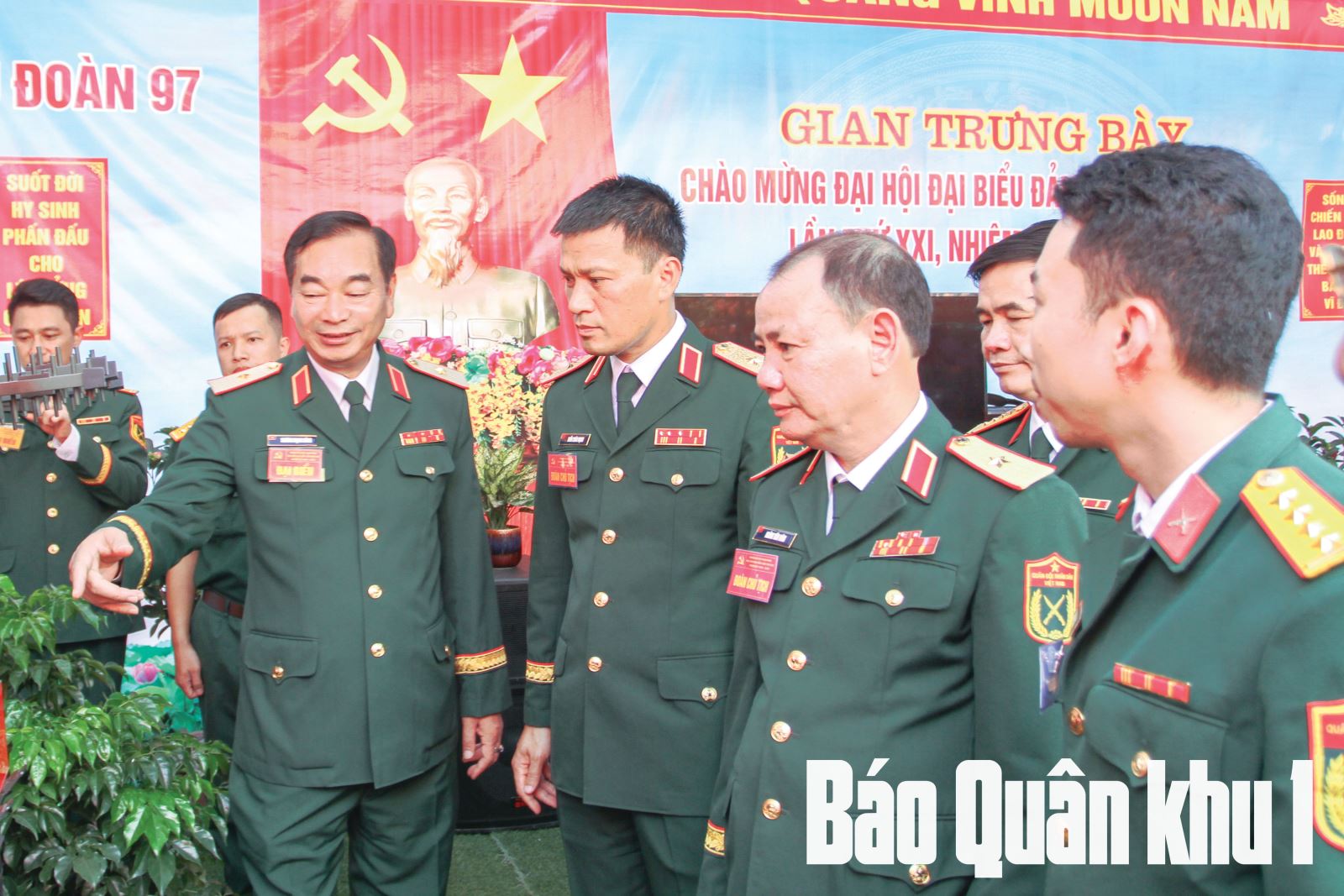 Thiếu tướng Trương Mạnh Dũng, Tư lệnh Quân khu và các đại biểu tham quan gian trưng bày tại Đại hội đại biểu Đảng bộ Bộ Tham mưu nhiệm kỳ 2025-2030. Ảnh: KHƯƠNG QUANG