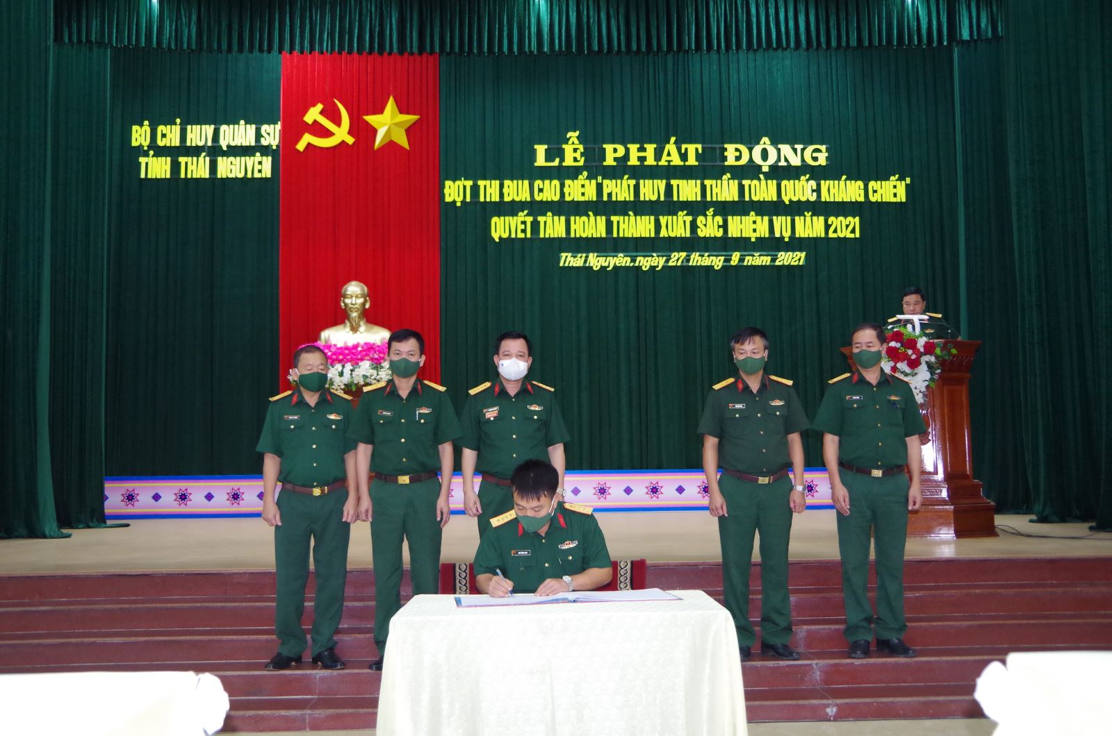 Lãnh đạo Bộ CHQS tỉnh Thái Nguyên ghi nhận giao ước thi đua của các cơ quan.