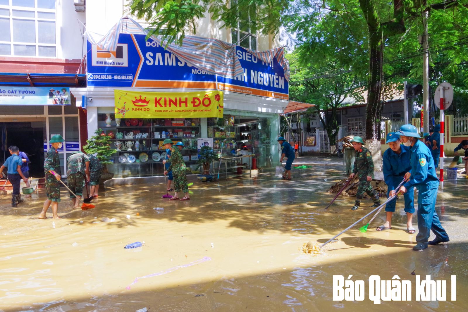 Sáng nay (8-10), Bộ CHQS tỉnh Cao Bằng đã huy động hơn 150 cán bộ, chiến sĩ, Bộ đội Biên phòng dọn dẹp bùn đất tại các tuyến phố chính của phường Thục Phán. Với phương châm nước rút đến đâu dọn ngay tới đó, không để bùn đất ùn ứ, các lực lượng đã tới từng nhà dân và cửa hàng kinh doanh giúp dọn dẹp bùn đất, khơi thông cống rãnh, tổng dọn vệ sinh.
