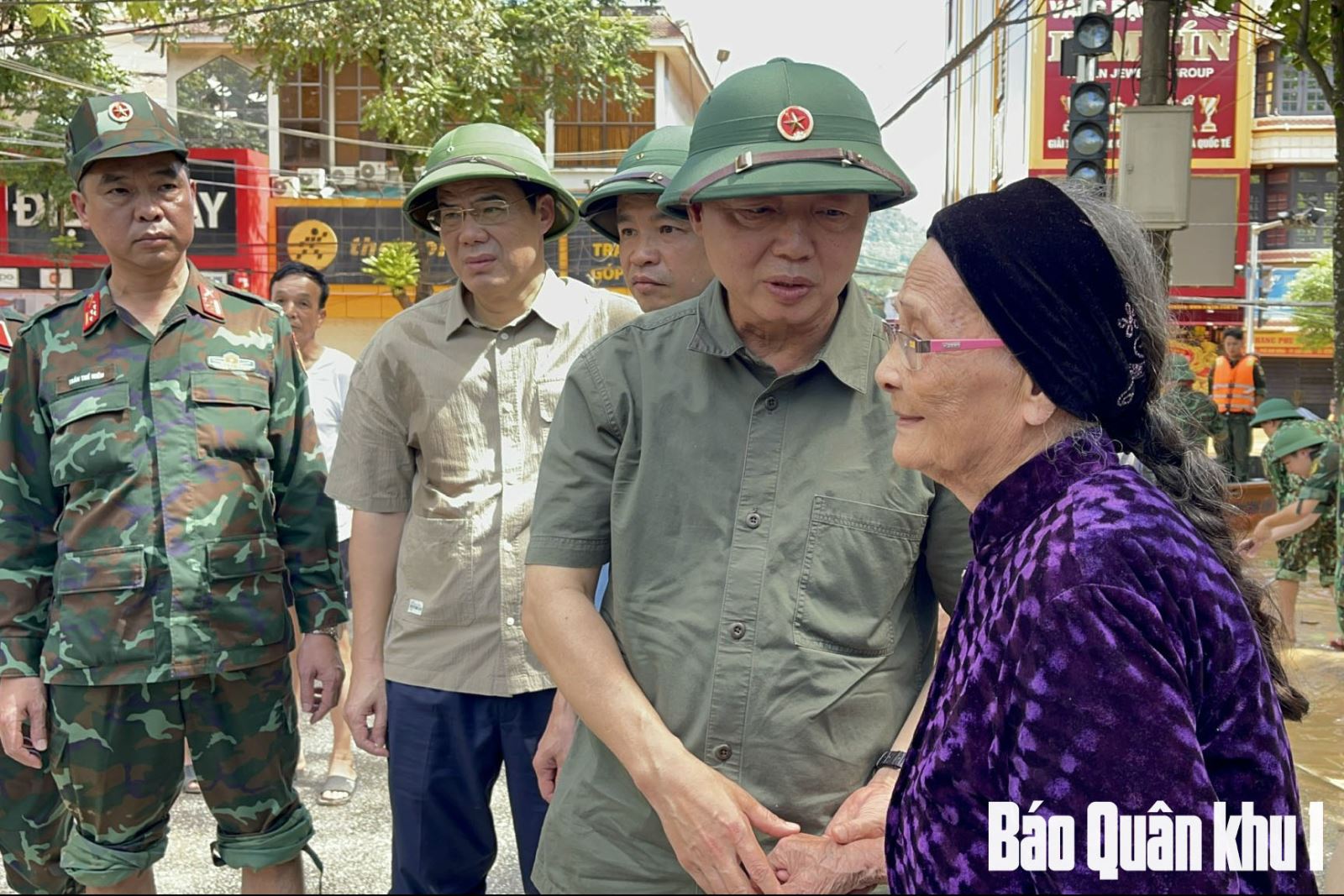 Phó thủ tướng Trần Hồng Hà ân cần thăm hỏi Bà mẹ Việt Nam anh hùng Lâm Thị Mèn (phường Thục Phán) - hộ gia đình bị ảnh hưởng của ngập lụt.