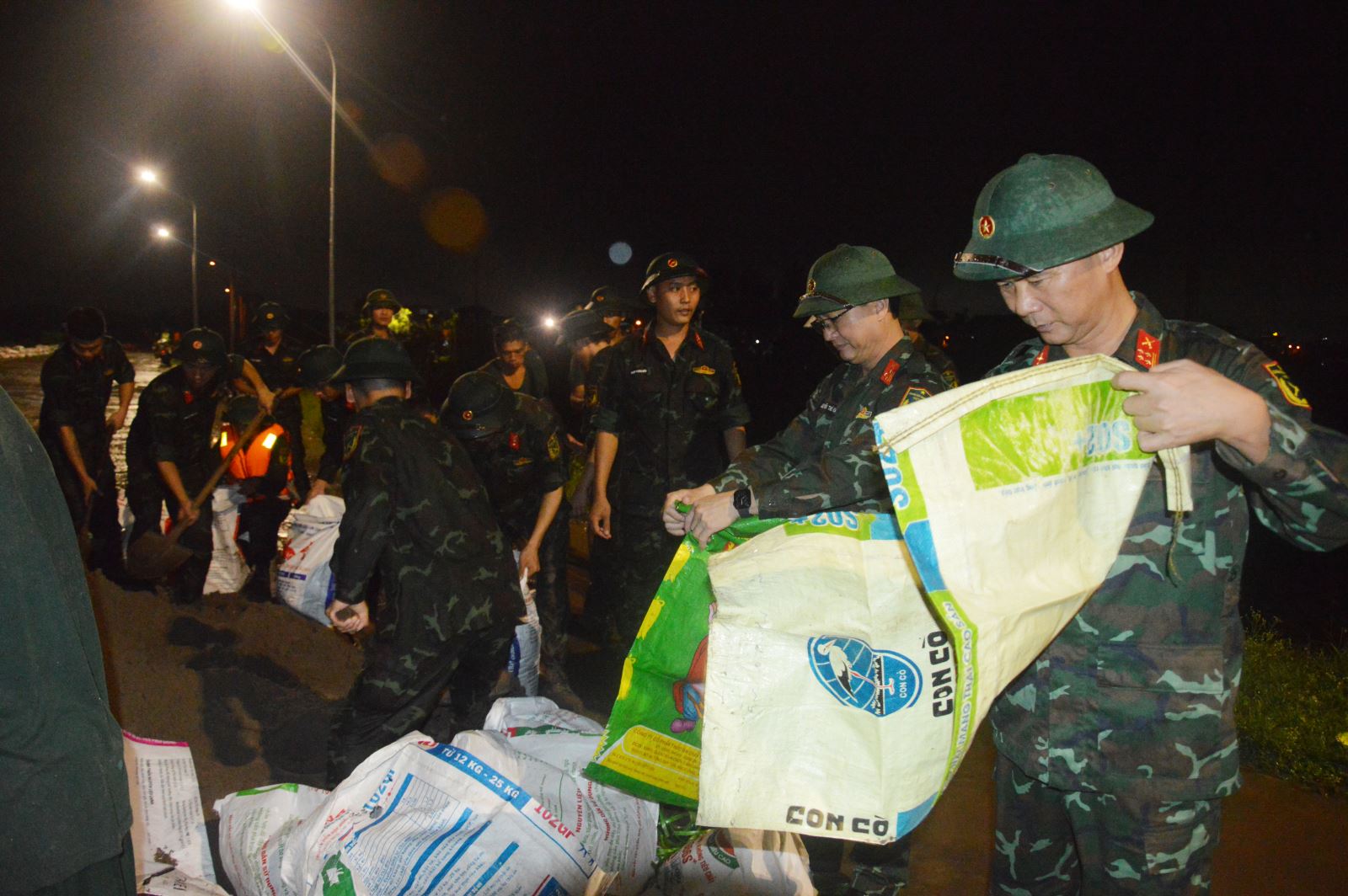 Cán bộ, chiến sĩ LLVT tỉnh Bắc Ninh dồn cát vào bao để đắp đê.