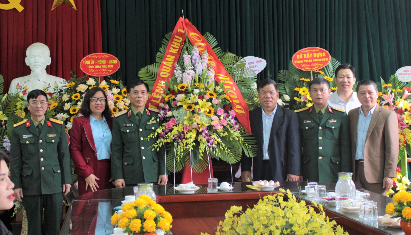 Thiếu tướng Lê Anh Tuấn, Phó tư lệnh Quân khu cùng các thành viên trong đoàn tặng hoa chúc mừng tập thể cán bộ, nhân viên bệnh viện Quân Y 108 nhân ngày thầy thuốc Việt Nam 27/2.