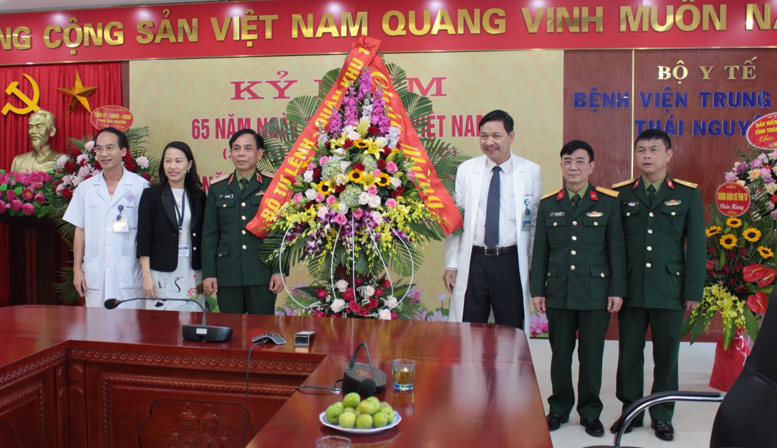 Đoàn công tác tặng hoa chúc mừng tập thể các Y, Bác sĩ Bệnh viện Trung ương Thái Nguyên.
