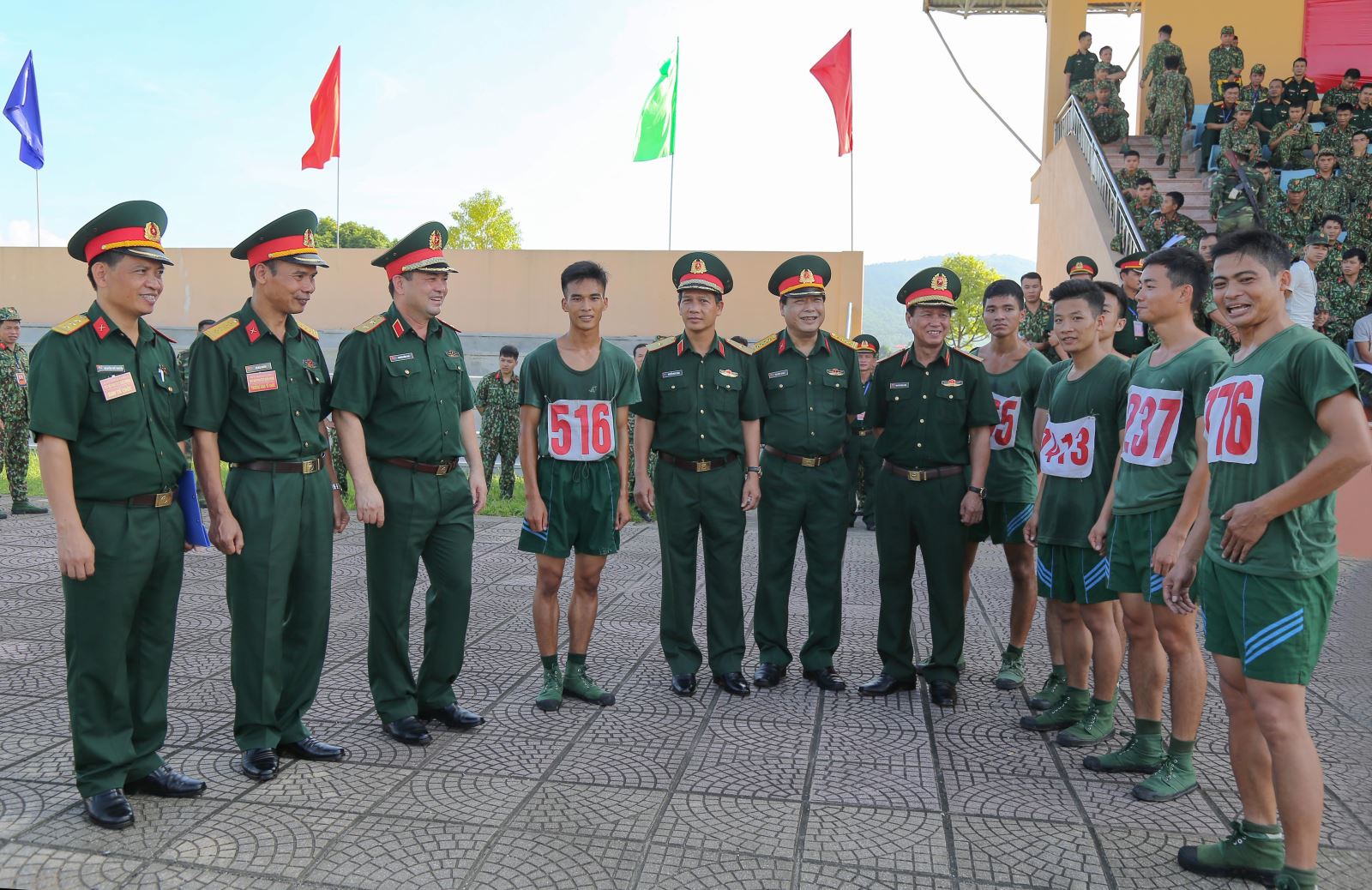 Trung tướng Nguyễn Hồng Thái, Tư lệnh Quân khu, Thiếu tướng Nguyễn Đình Chiêu, Phó chính ủy Quân khu trao cờ lưu niệm cho các đoàn tham gia hội thao.