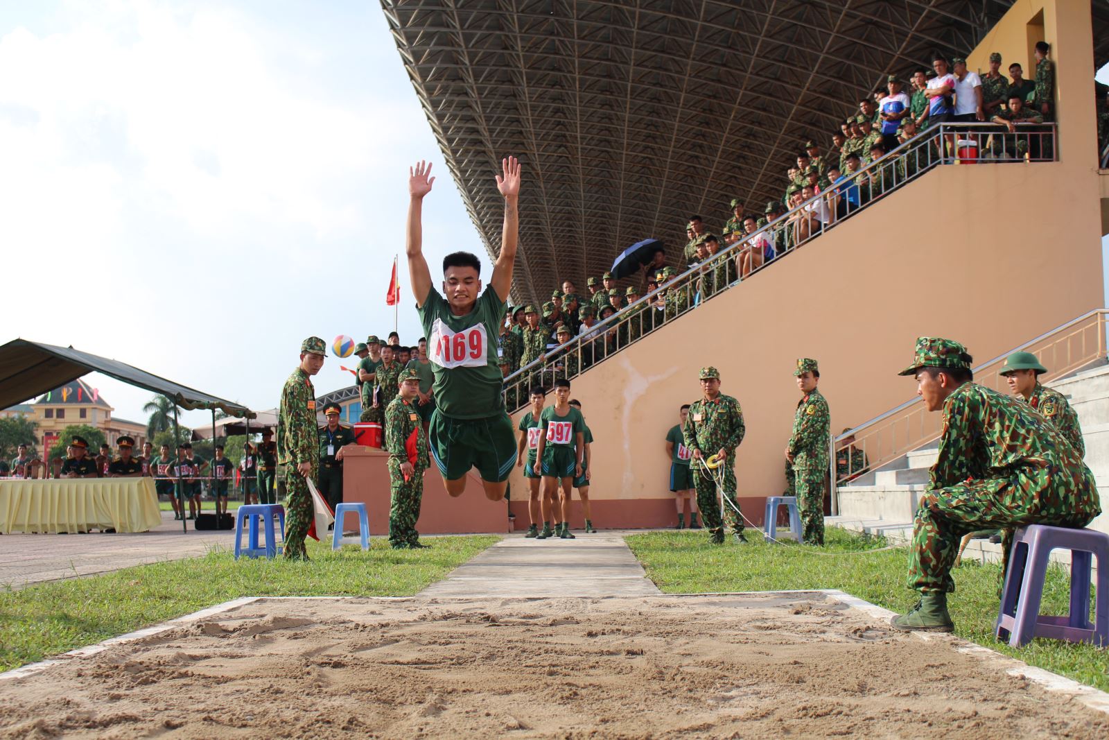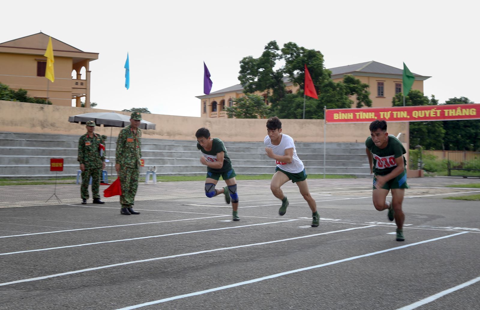Thủ trưởng Bộ tư lệnh, cơ quan Quân khu động viện các vận động viên tranh tài ở nội dung chạy 100m.