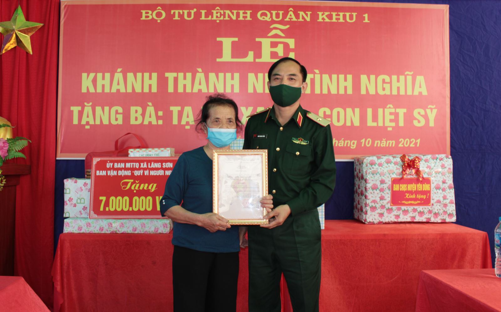 Chiều 26-10, Bộ tư lệnh Quân khu tổ chức Lễ khánh thành nhà tình nghĩa tặng gia đình bà Tạ Thị Xanh, thôn Đông Thượng, xã Lãng Sơn, huyện Yên Dũng, tỉnh Bắc Giang - con liệt sĩ Chu Văn Đắc, hy sinh trong kháng chiến chống thực dân Pháp. Thiếu tướng Ngô Quang Hưng, Phó chủ nhiệm Chính trị Quân khu dự và trao quyết định tặng nhà tình nghĩa. Cùng dự có đại biểu Phòng Chính sách Quân khu; Bộ CHQS tỉnh Bắc Giang; đại biểu Huyện ủy, HĐND, UBND huyện Yên Dũng và xã Lãng Sơn.