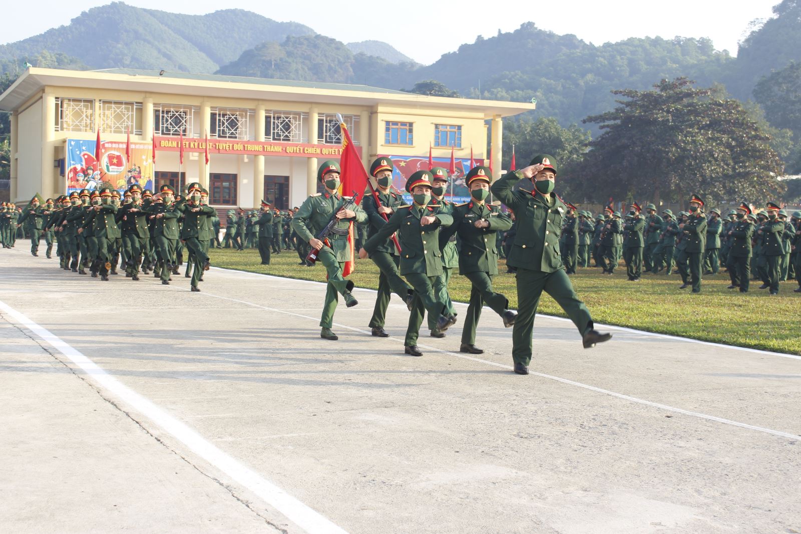 Cán bộ, chiến sĩ Trung đoàn 246 thực hiện nội dung chào cờ, duyệt đội ngũ cấp Trung đoàn.