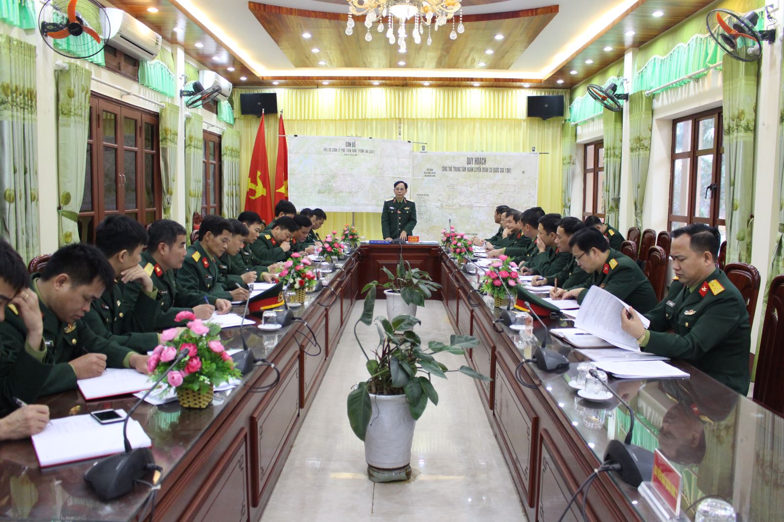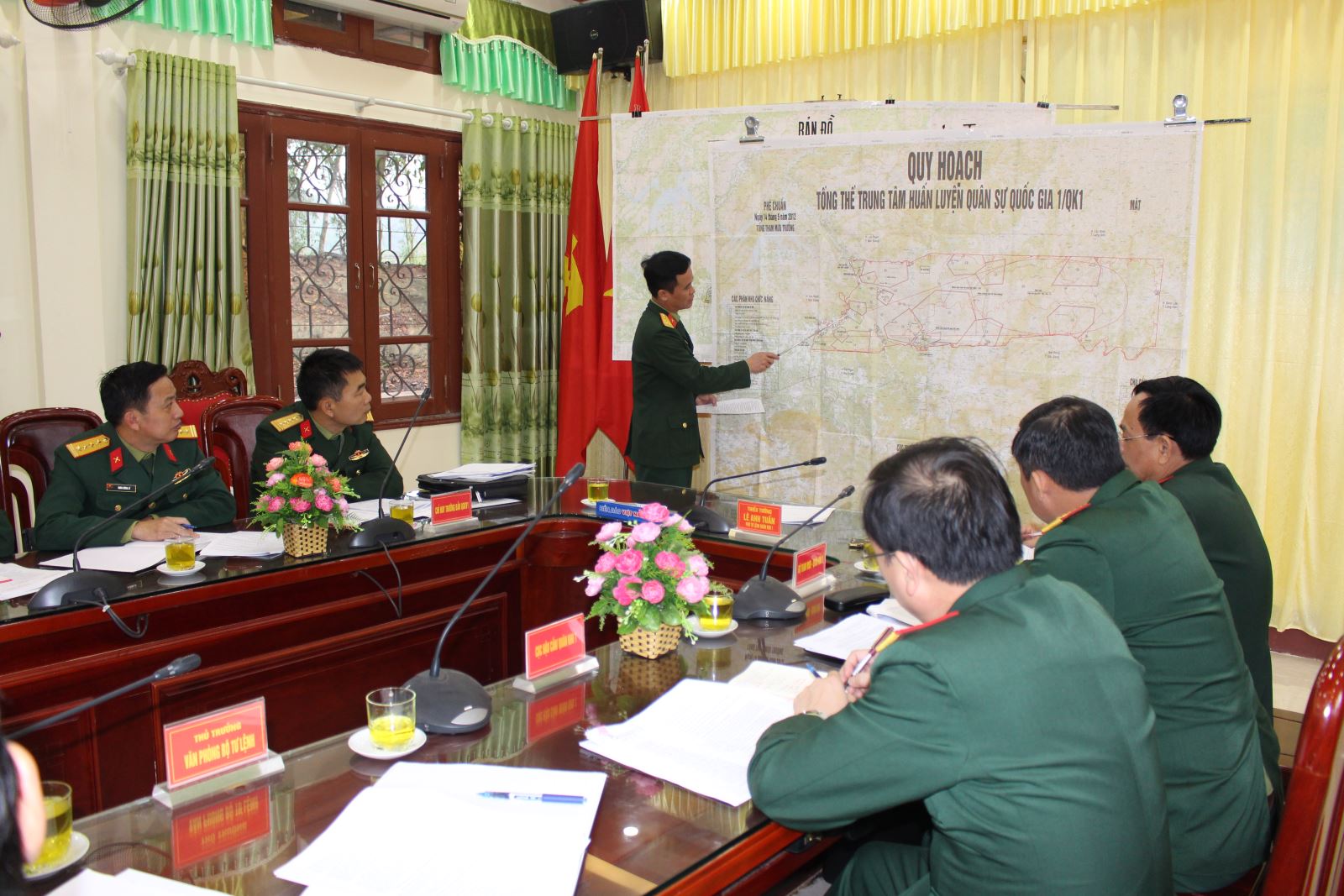 Chỉ huy đơn vị báo cáo công tác quy hoạch trung tâm huấn luyện quân sự quốc gia với đoàn công tác.