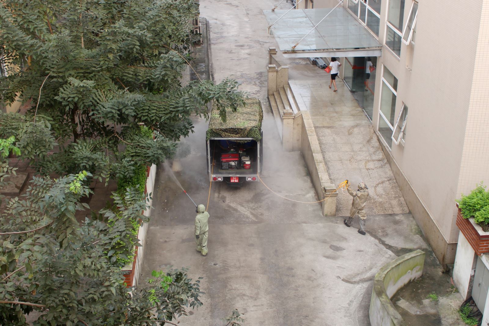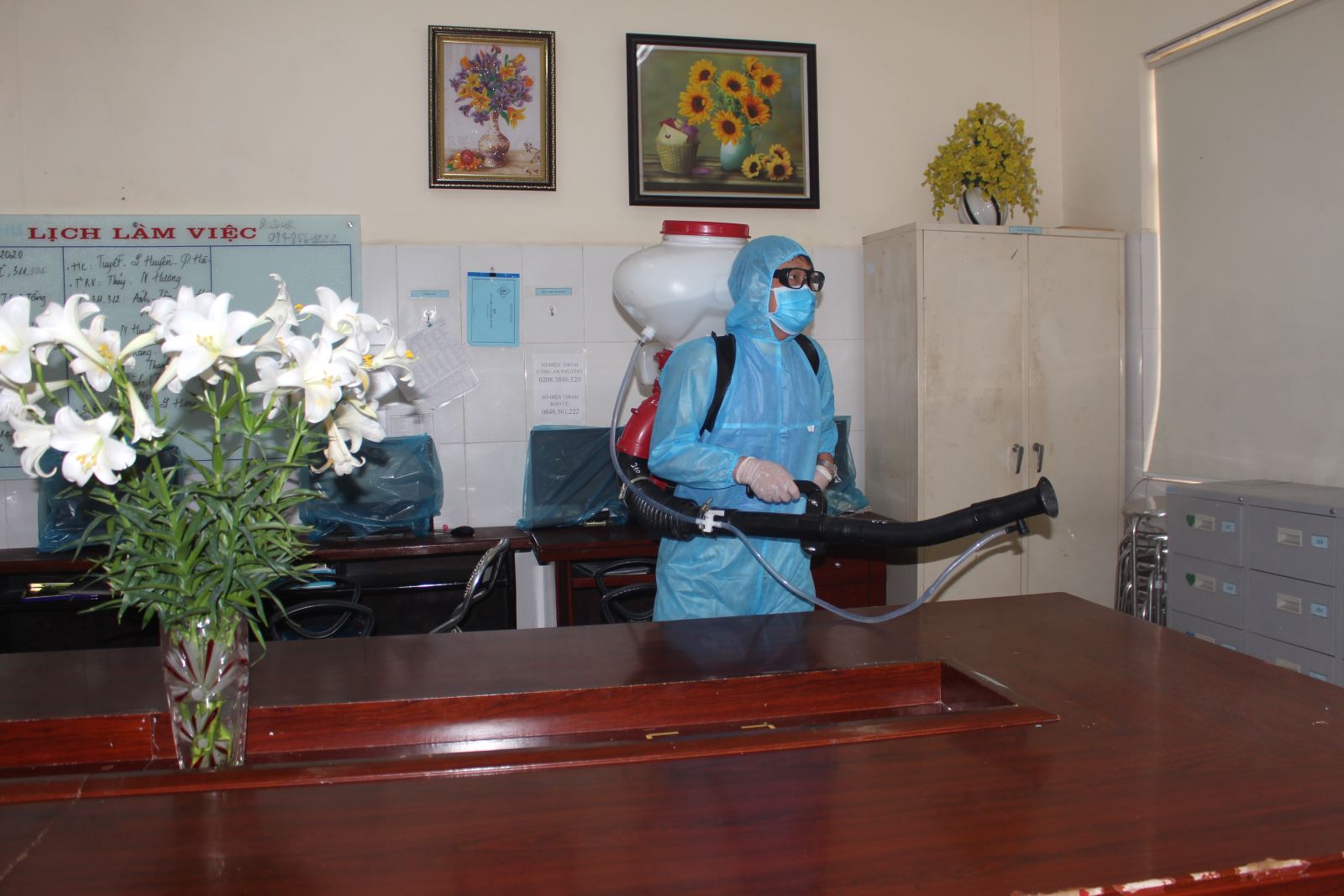 Phun hóa chất khử trùng trong các phòng hẹp của bệnh viện.