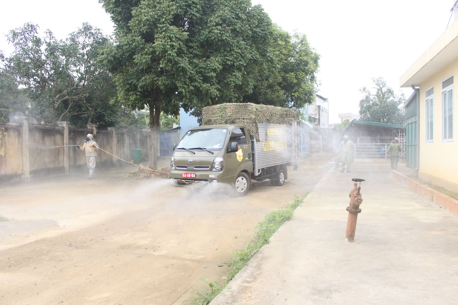 Đoàn công tác Quân khu theo dõi, kiểm tra công tác phun hóa chất khử trùng tại Bệnh viện đa khoa huyện Đại Từ, tỉnh Thái Nguyên.