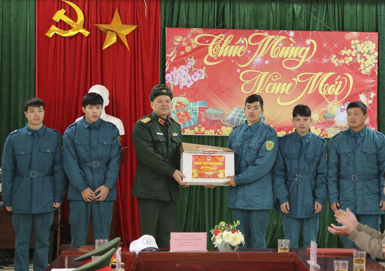 Trung tướng Dương Đình Thông, Bí thư Đảng ủy, Chính ủy Quân khu tặng quà, chúc tết Tiểu đội dân quân thường trực xã Lũng Nặm, huyện Hà Quảng, tỉnh Cao Bằng.