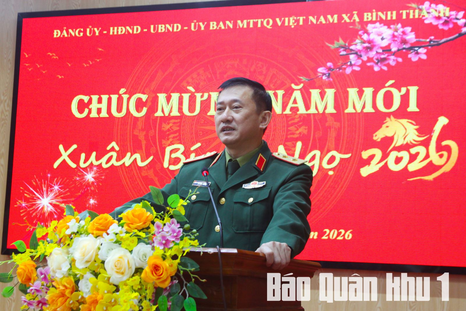 Trung tướng La Công Phương, Ủy viên Trung ương Đảng, Bí thư Đảng ủy, Chính ủy Quân khu phát biểu chúc tết cấp ủy, chính quyền địa phương và nhân dân xã Bình Thành