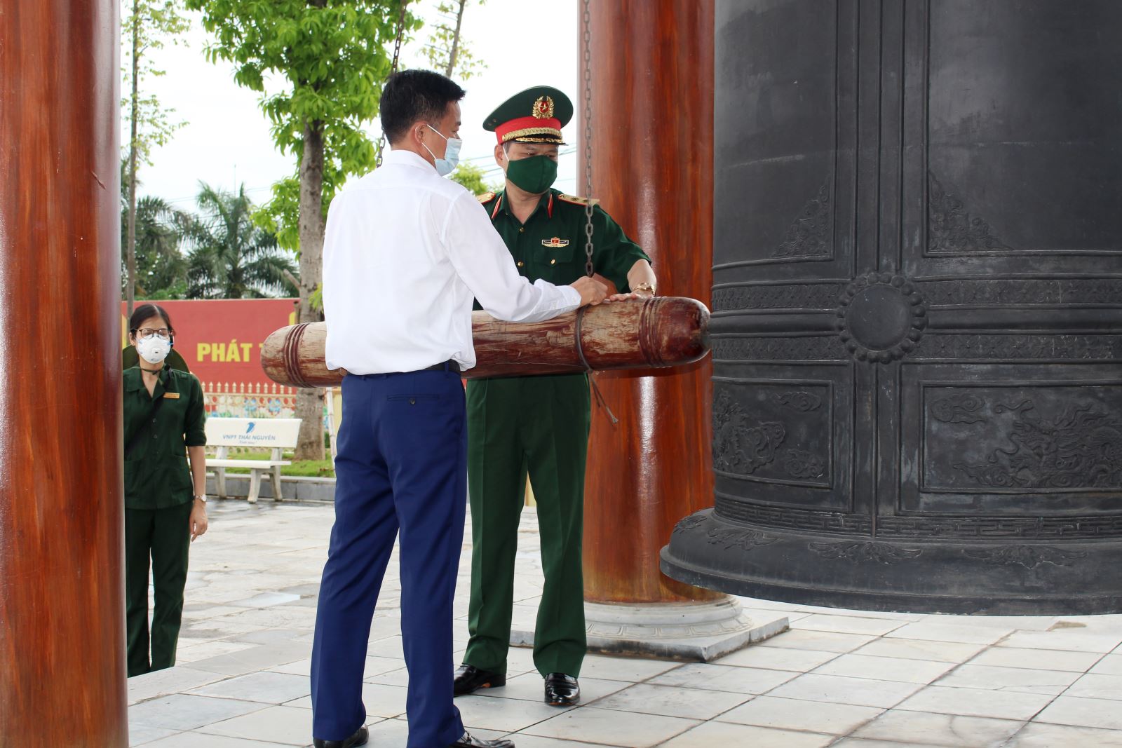 Trung tướng Dương Đình Thông, Bí thư Đảng ủy, Chính ủy Quân khu cùng lãnh đạo TP Thái Nguyên thỉnh chuông tại Khu di tích lịch sử Quốc gia liệt sĩ Thanh niên xung phong Đại đội 915.