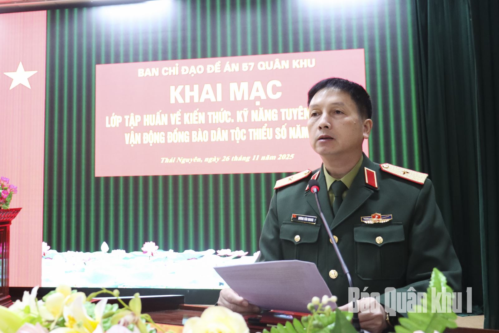Ngày 26-11, Ban chỉ đạo Đề án 57 Quân khu tổ chức lớp tập huấn kiến thức, kỹ năng tuyên truyền, vận động đồng bào dân tộc thiểu số năm 2025. Thiếu tướng Dương Văn Quang, Phó Chính ủy Quân khu dự và phát biểu khai mạc.