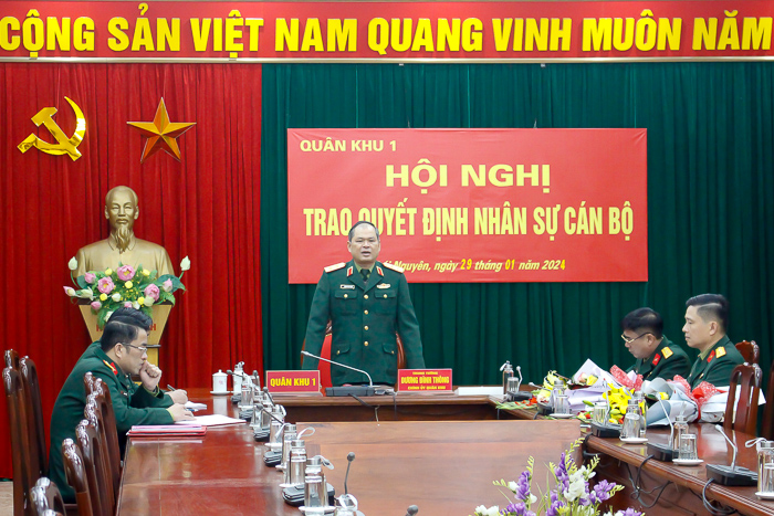 Phát biểu tại hội nghị, Trung tướng Dương Đình Thông, Bí thư Đảng ủy, Chính ủy Quân khu chúc mừng hai đồng chí được bổ nhiệm chức vụ đợt này; đồng thời yêu cầu các đồng chí trên cương vị mới tiếp tục phấn đấu, rèn luyện nâng cao trình độ, năng lực, phương pháp, tác phong công tác; phát huy tinh thần nêu gương, thường xuyên chăm lo, xây dựng mối đoàn kết, thống nhất trong cơ quan, đơn vị; giữ vững nguyên tắc lãnh đạo của Đảng và giải quyết hài hòa mối quan hệ trong cấp ủy, chỉ huy và với cấp ủy, chính quyền địa phương. Tăng cường quán triệt, nắm vững và cụ thể hóa các chỉ thị, nghị quyết, quy chế, quy định của trên; tham mưu giúp cấp ủy, chính quyền địa phương thực hiện tốt nhiệm vụ quân sự, quốc phòng.