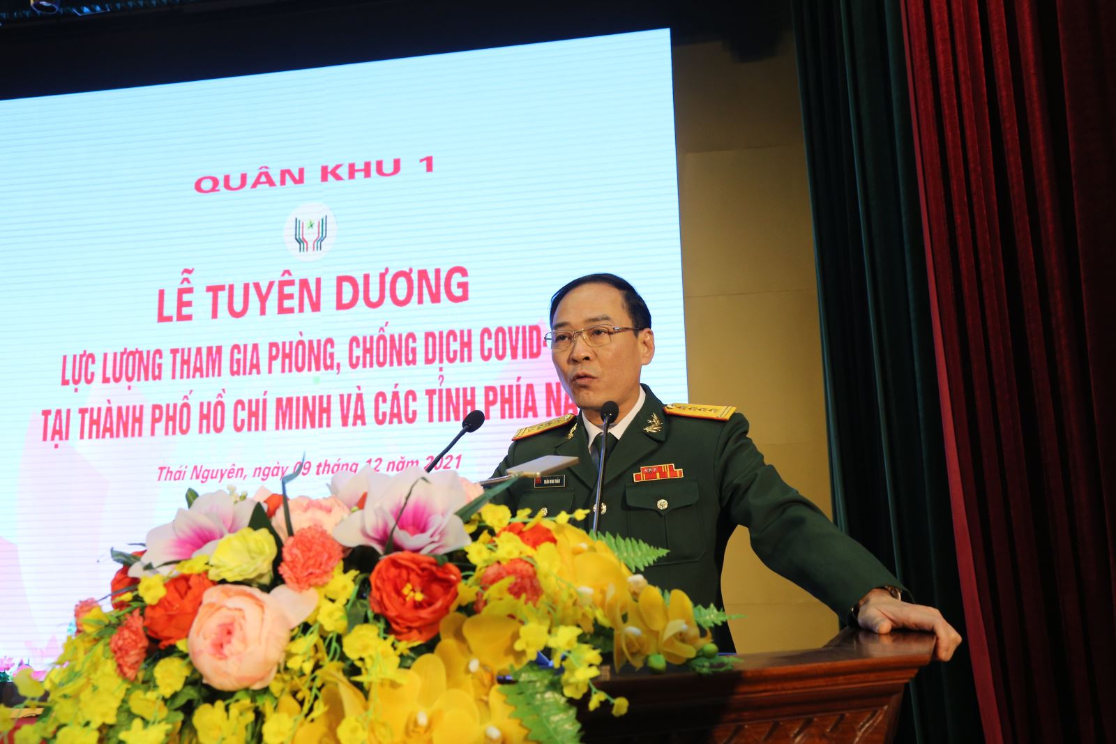 Tại lễ tuyên dương, các đại biểu nghe Đại tá Trần Minh Toản, Chủ nhiệm Hậu cần Quân khu, Phó trưởng Ban chỉ đạo phòng, chống dịch Covid-19 Quân khu trình bày báo cáo kết quả tham gia phòng, chống dịch Covid-19 tại TP Hồ Chí Minh và các tỉnh phía Nam. Khi đợt dịch Covid-19 lần thứ tư bùng phát, từ tâm dịch hai tỉnh Bắc Ninh, Bắc Giang trên địa bàn Quân khu, đến tâm dịch TP Hồ Chí Minh và một số tỉnh phía Nam, số ca mắc Covid-19 hàng ngày liên tục tăng cao, có ngày lên đến hàng chục nghìn người và đã cướp đi sinh mạng 27 nghìn người. Hưởng ứng Lời kêu gọi toàn dân đoàn kết phòng, chống đại dịch Covid-19 của Tổng Bí thư Nguyễn Phú Trọng và phong trào thi đua đặc biệt “Quân đội cùng cả nước chung sức, đồng lòng thi đua phòng chống và chiến thắng đại dịch Covid 19” do Quân ủy Trung ương, Bộ Quốc phòng phát động; Quân khu 1 đã cử 3 đoàn công tác gồm 120 y, bác sĩ và 5 đồng chí lái xe, kịp thời có mặt ở các điểm nóng về dịch bệnh Covid-19 tại TP Hồ Chí Minh và hai tỉnh Bình Dương, Đồng Nai.