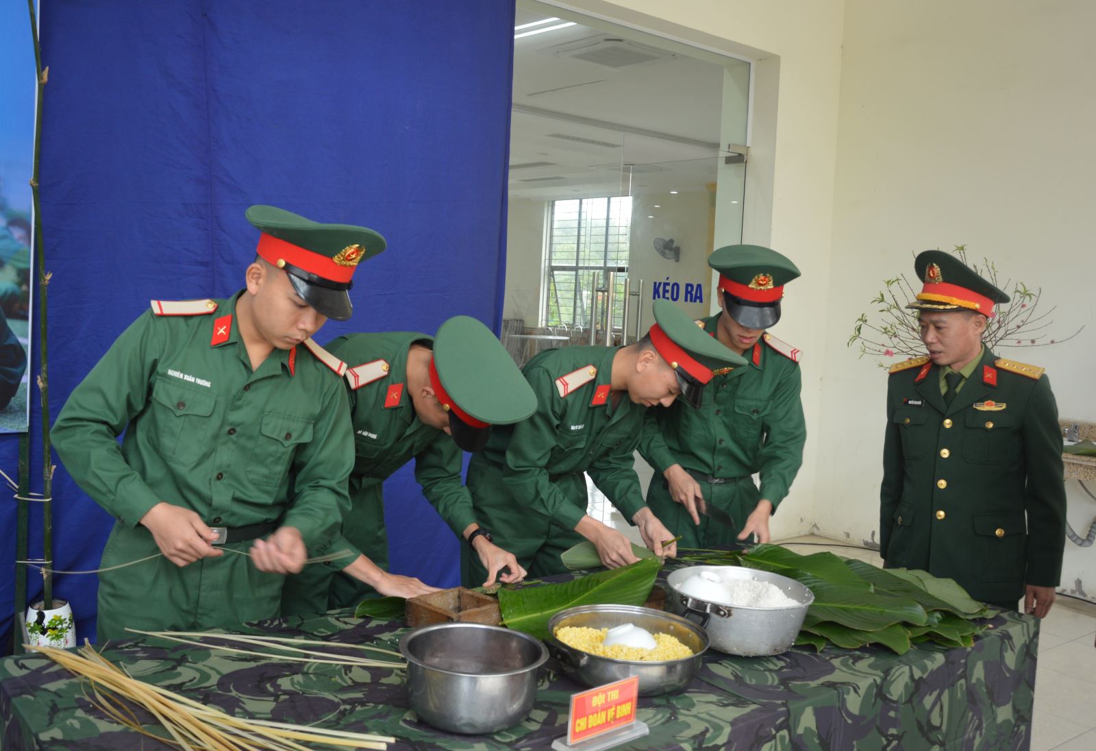 Cán bộ, chiến sĩ LLVT tỉnh Bắc Ninh gói bánh chưng xanh đón tết.