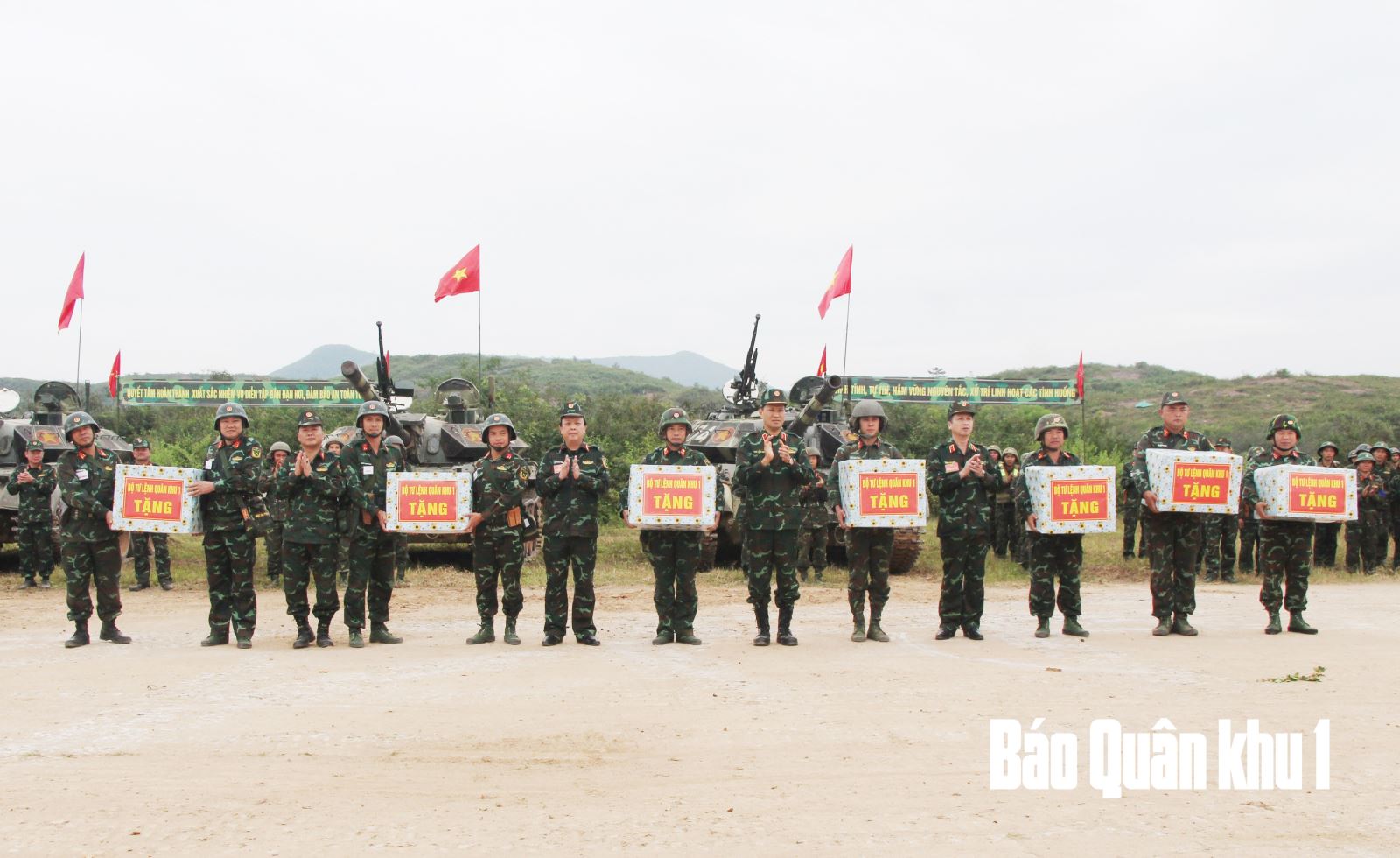 Ban chỉ đạo diễn tập Quân khu tặng quà động viên các đơn vị thực binh, bắn đạn hơi trong diễn tập.