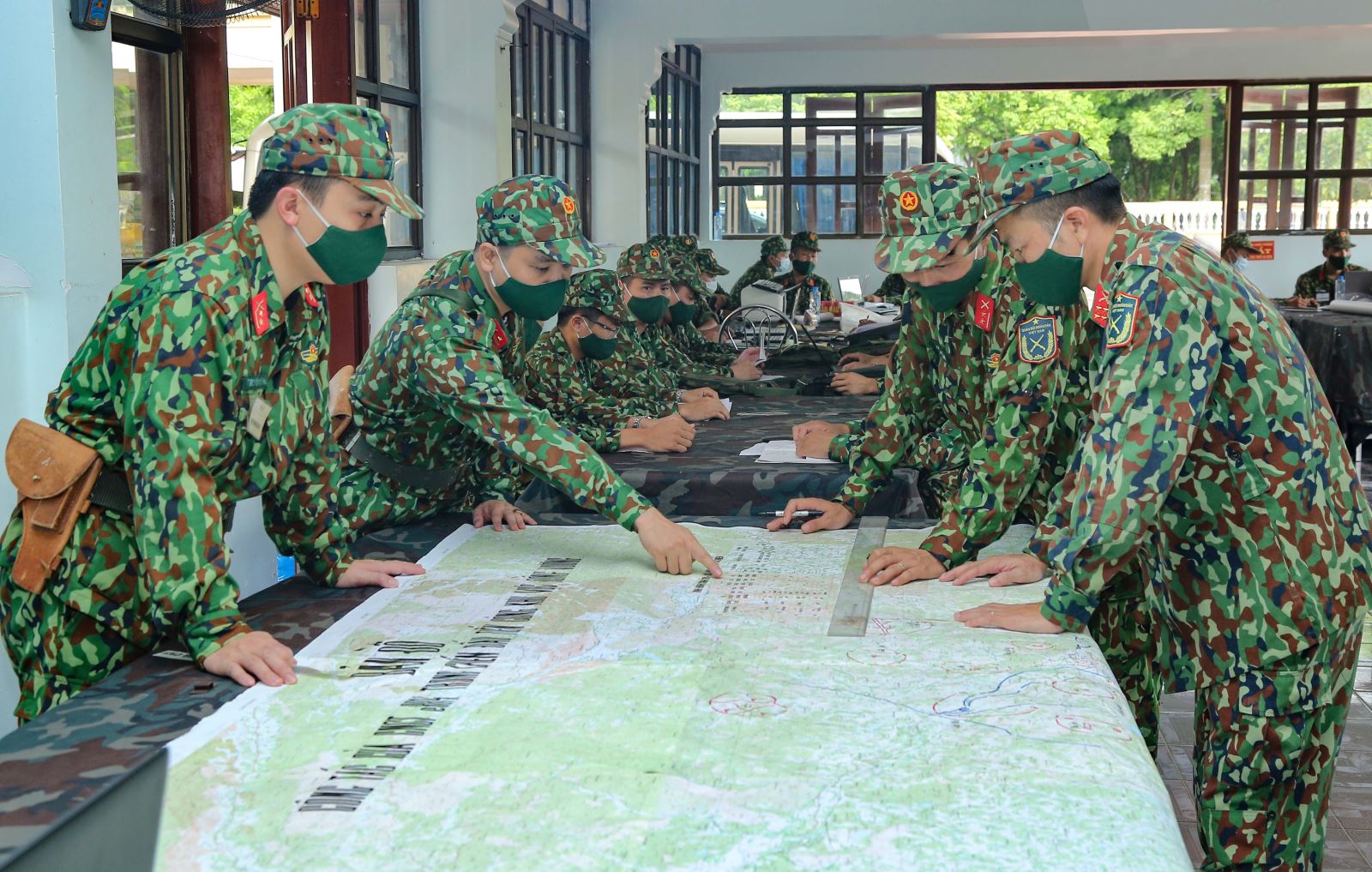 Khung tập Trung đoàn 12 thực hành tác nghiệp trên bản đồ.