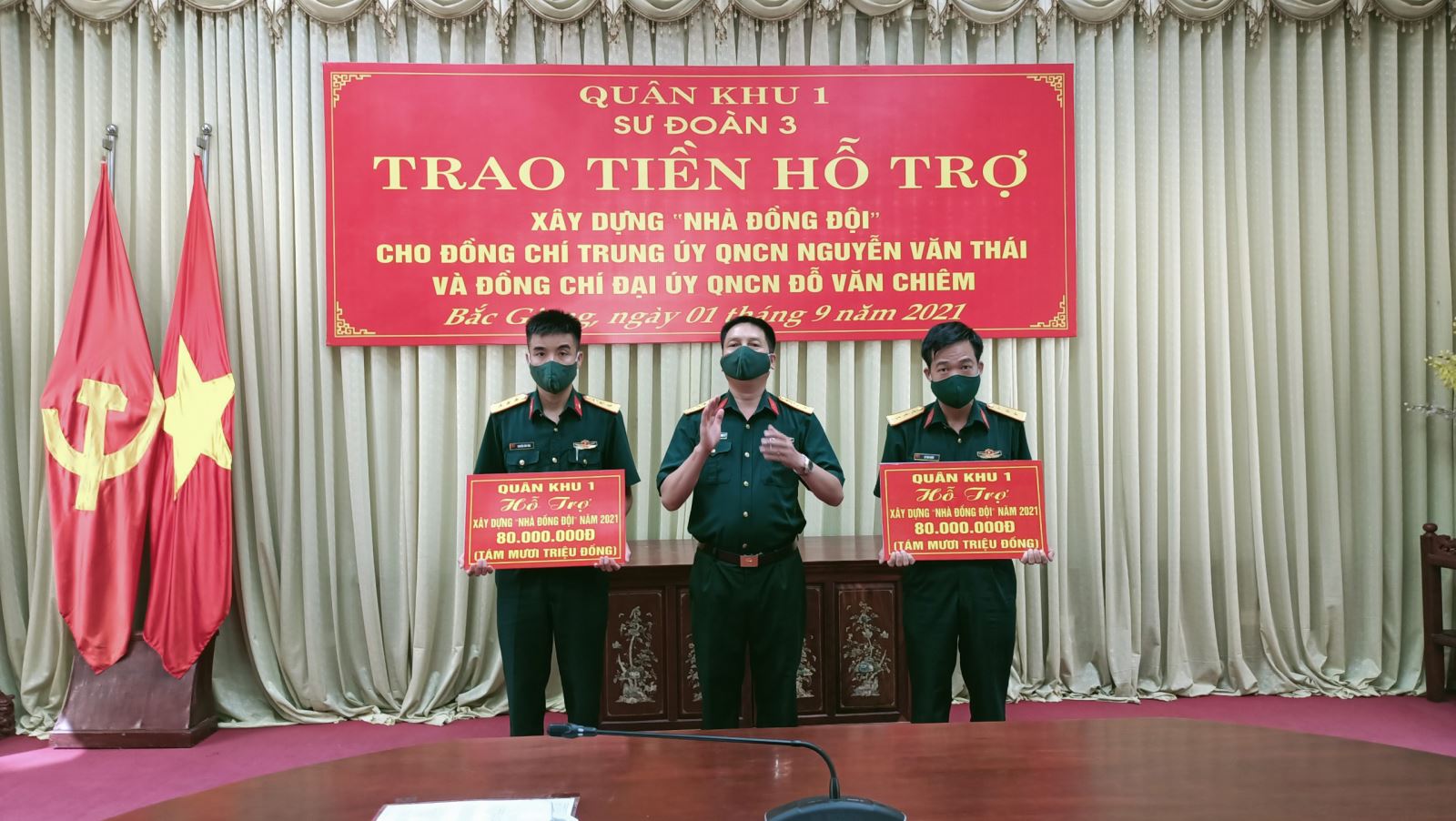 Thừa ủy quyền của Bộ tư lệnh Quân khu, Đại tá Dương Văn Quang, Phó Chính ủy Sư đoàn 3 đã trao kinh phí hỗ trợ cho Trung úy QNCN Nguyễn Văn Thái, Lái xe, Ban Hành chính (Phòng Tham mưu Sư đoàn) và Đại úy QNCN Đỗ Văn Chiêm, Thợ sửa chữa, Ban Thông tin (Phòng Tham mưu Sư đoàn), số tiền 80 triệu đồng/người, từ nguồn Quỹ “Vì người nghèo” của Quân khu và số tiền 30 triệu đồng/người, từ nguồn “Quỹ đồng đội” của Sư đoàn. Tổng số tiền hỗ trợ mỗi đồng chí 110 triệu đồng.