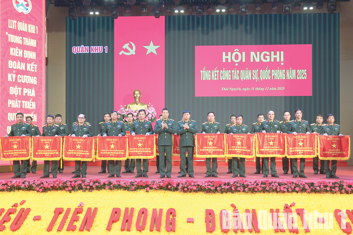 Thiếu tướng Trần Xuân Mạnh, Phó Tư lệnh, Tham mưu trưởng Quân khu và Thiếu tướng Đỗ Văn Tuấn, Phó Tư lệnh Quân khu trao Cờ thi đua tặng các tập thể xuất sắc trong Phong trào Thi đua Quyết thắng năm 2025. Ảnh: KHƯƠNG QUANG