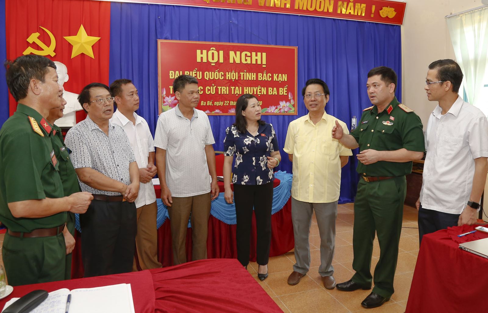 Thiếu tướng Nguyễn Hồng Thái, Tư lệnh Quân khu cùng đoàn đại biểu Quốc hội tỉnh Bắc Kạn trò chuyện cùng cử tri huyện Ba Bể trong giờ nghỉ của hội nghị.