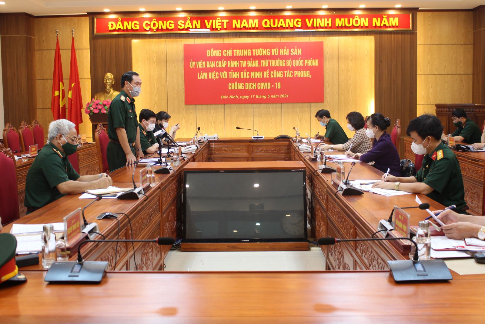 Sáng 17-5, đoàn công tác Bộ Quốc phòng (BQP) do Trung tướng Vũ Hải Sản, Ủy viên Trung ương Đảng, Thứ trưởng BQP, Trưởng Ban chỉ đạo phòng, chống dịch (PCD) Covid-19 BQP làm trưởng đoàn đã đến làm việc với tỉnh Bắc Ninh về công tác PCD Covid-19. Cùng đi có Thiếu tướng Lê Anh Tuấn, Phó tư lệnh, Trưởng Ban Chỉ đạo PCD Quân khu 1; Thiếu tướng Nguyễn Xuân Kiên, Cục trưởng Cục Quân Y (Tổng Cục Hậu cần). Đón tiếp và làm việc với đoàn công tác có các đồng chí: Đào Hồng Lan, Ủy viên Trung ương Đảng, Bí thư Tỉnh ủy; Nguyễn Hương Giang, Phó bí thư Tỉnh ủy, Chủ tịch UBND tỉnh Bắc Ninh; cùng lãnh đạo Bộ CHQS tỉnh và một số sở, ngành của tỉnh Bắc Ninh.