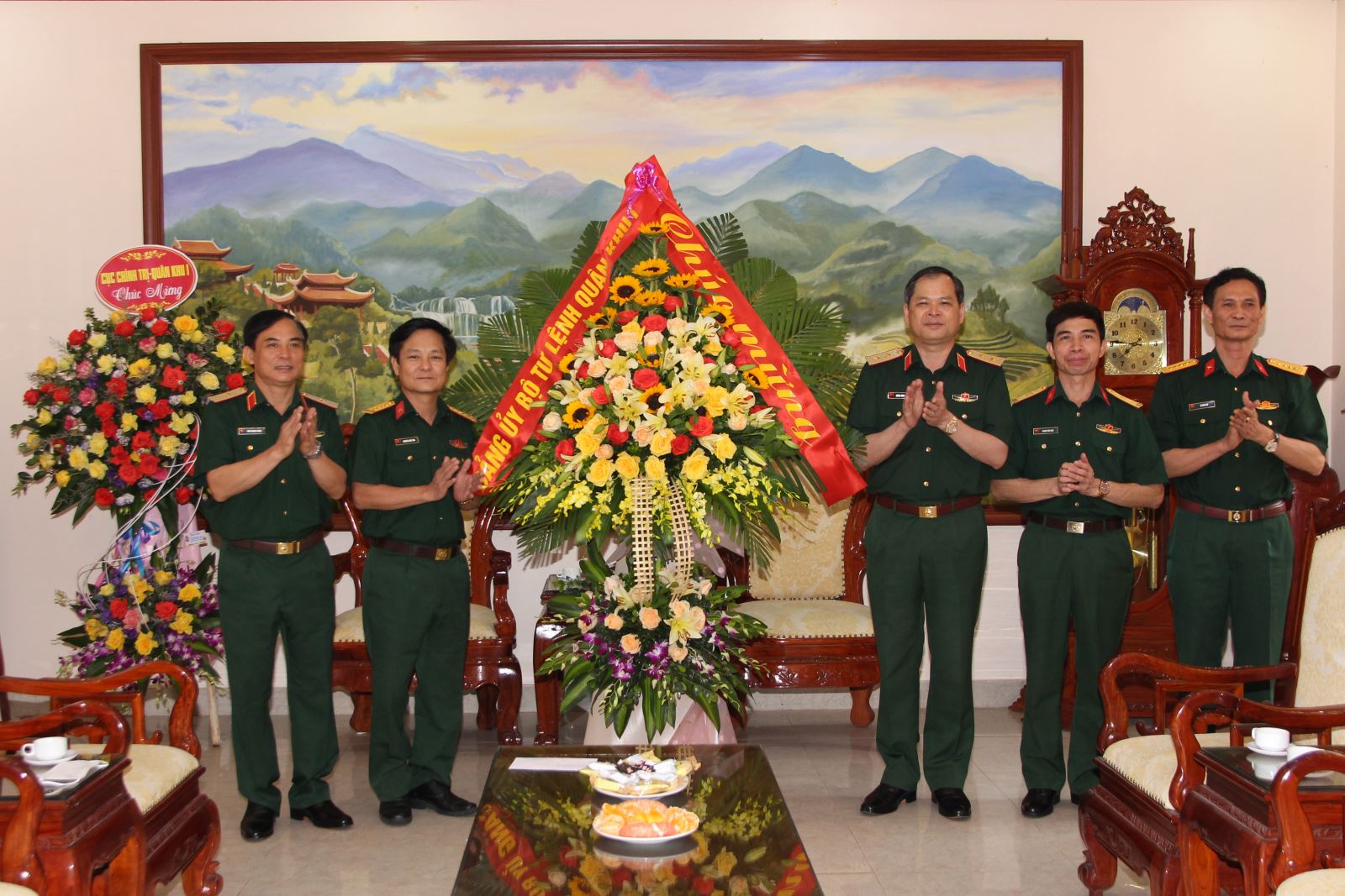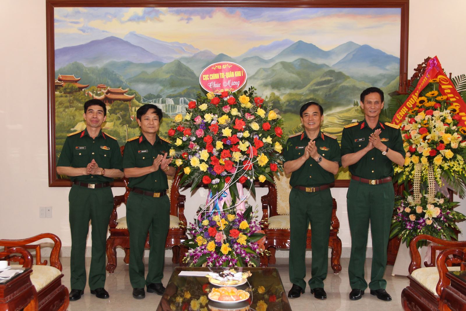 Thủ trưởng Cục Chính trị Quân khu tặng hoa chúc mừng Phòng Tuyên huấn.