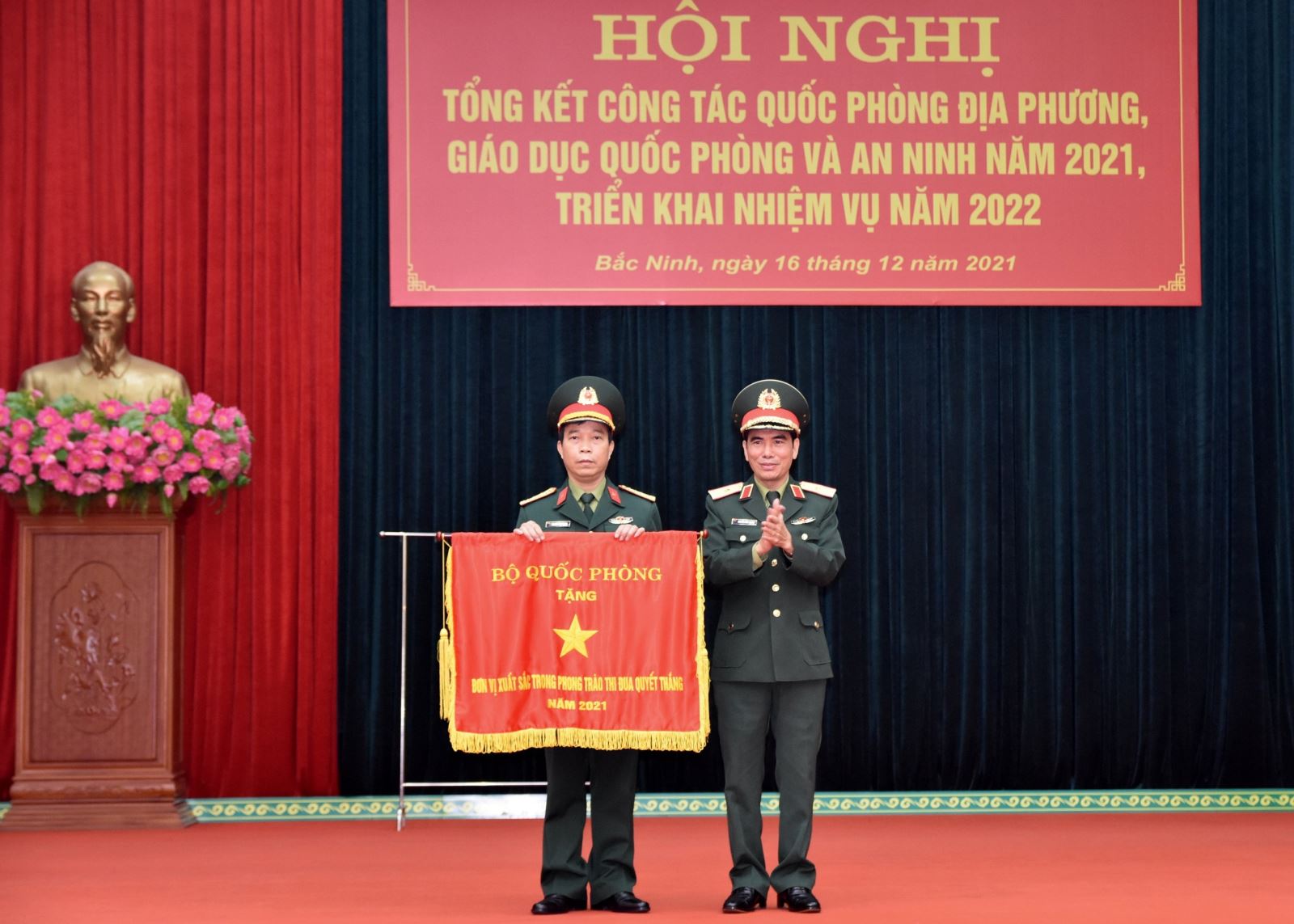 Thiếu tướng Nguyễn Đình Chiêu, Phó chính ủy Quân khu trao Cờ thi đua của Bộ Quốc phòng tặng Bộ CHQS tỉnh Bắc Ninh. Ảnh: VIẾT THỰC