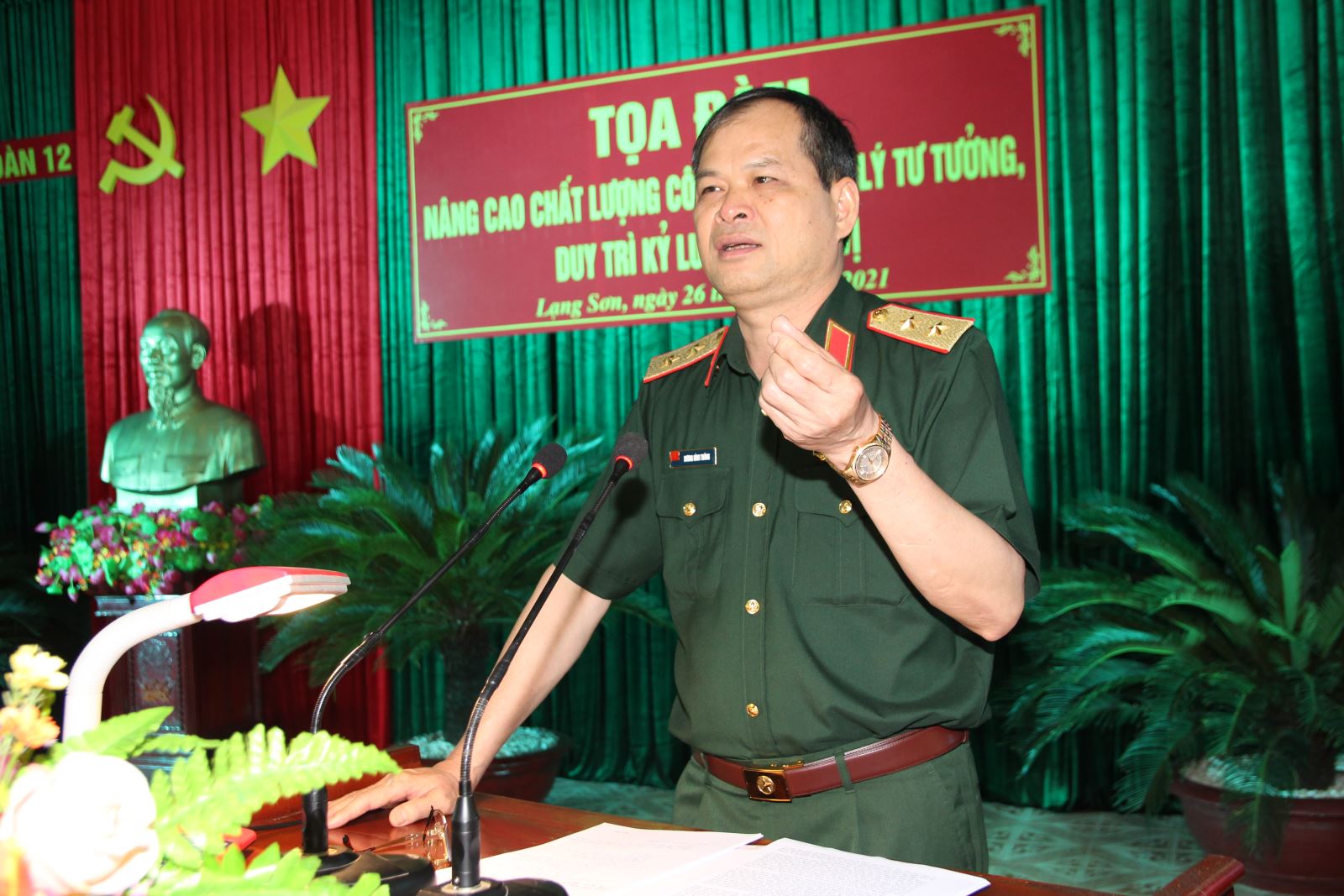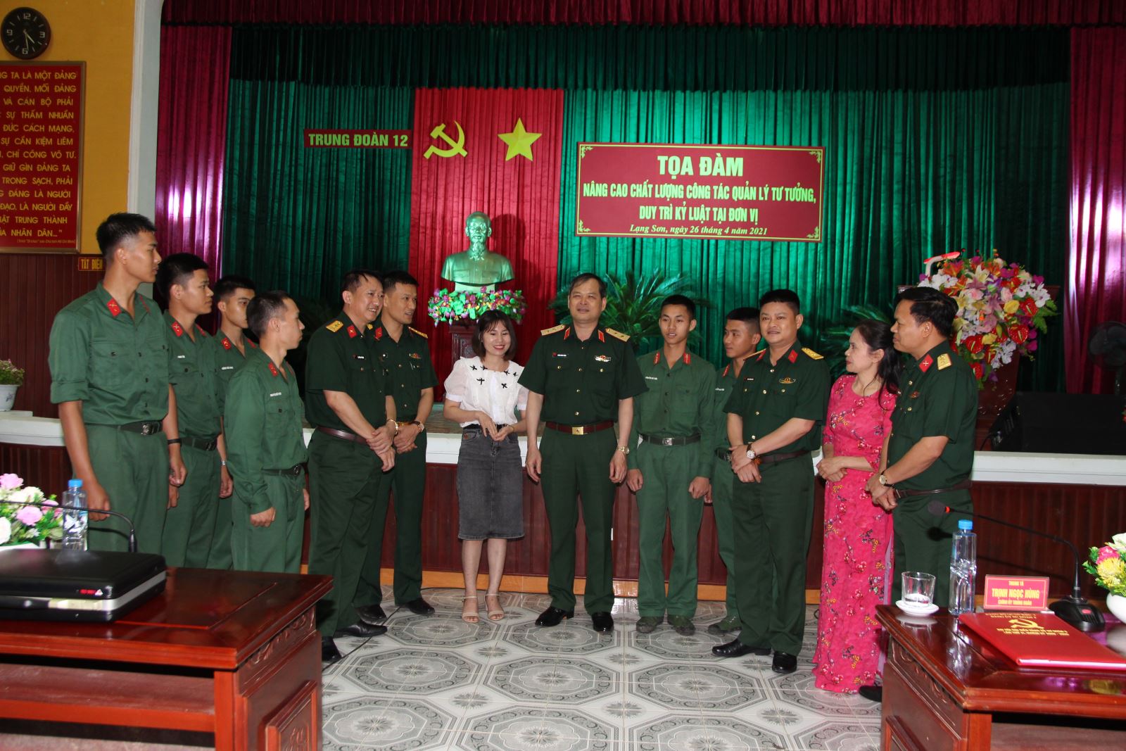 Chiều 26-4, Trung đoàn 12 (Sư đoàn 3) tổ chức tọa đàm nâng cao chất lượng công tác quản lý tư tưởng, duy trì kỷ luật tại đơn vị. Trung tướng Dương Đình Thông, Bí thư Đảng ủy, Chính ủy Quân khu dự và phát biểu tại buổi tọa đàm.