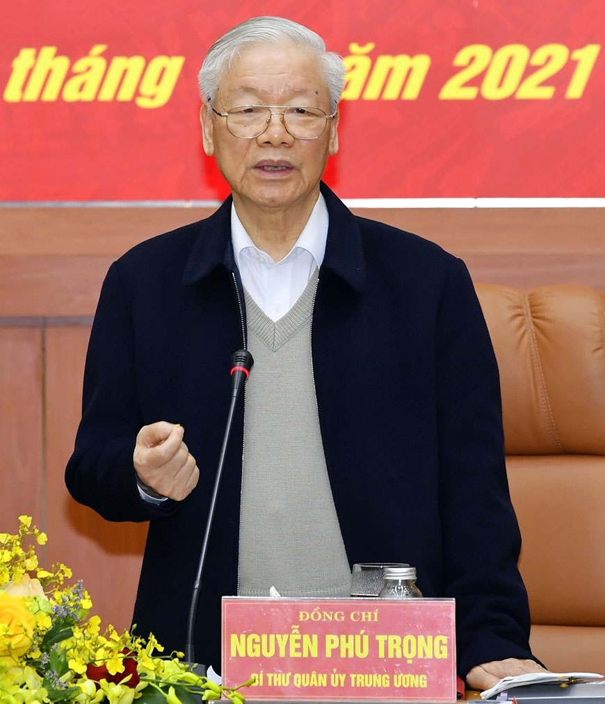 Điểm lại những kết quả nổi bật trong năm 2021, bày tỏ sự đồng tình với phương hướng, nhiệm vụ năm 2022, Tổng Bí thư Nguyễn Phú Trọng nhấn mạnh việc thực hiện tốt chức năng tham mưu với Đảng, Nhà nước về nhiệm vụ quân sự, quốc phòng; bảo vệ vững chắc độc lập, chủ quyền, toàn vẹn lãnh thổ của đất nước, nhất là ở vùng biên giới, biển, đảo và chống tiêu cực trên không gian mạng.