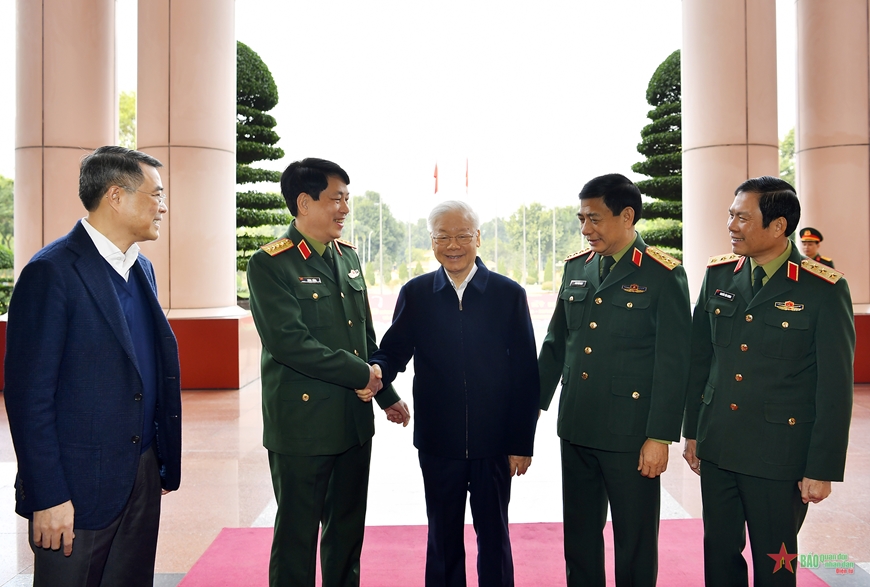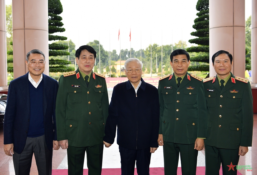 Các đồng chí lãnh đạo Quân ủy Trung ương, Bộ Quốc phòng đón Tổng Bí thư Nguyễn Phú Trọng, Bí thư Quân ủy Trung ương.
