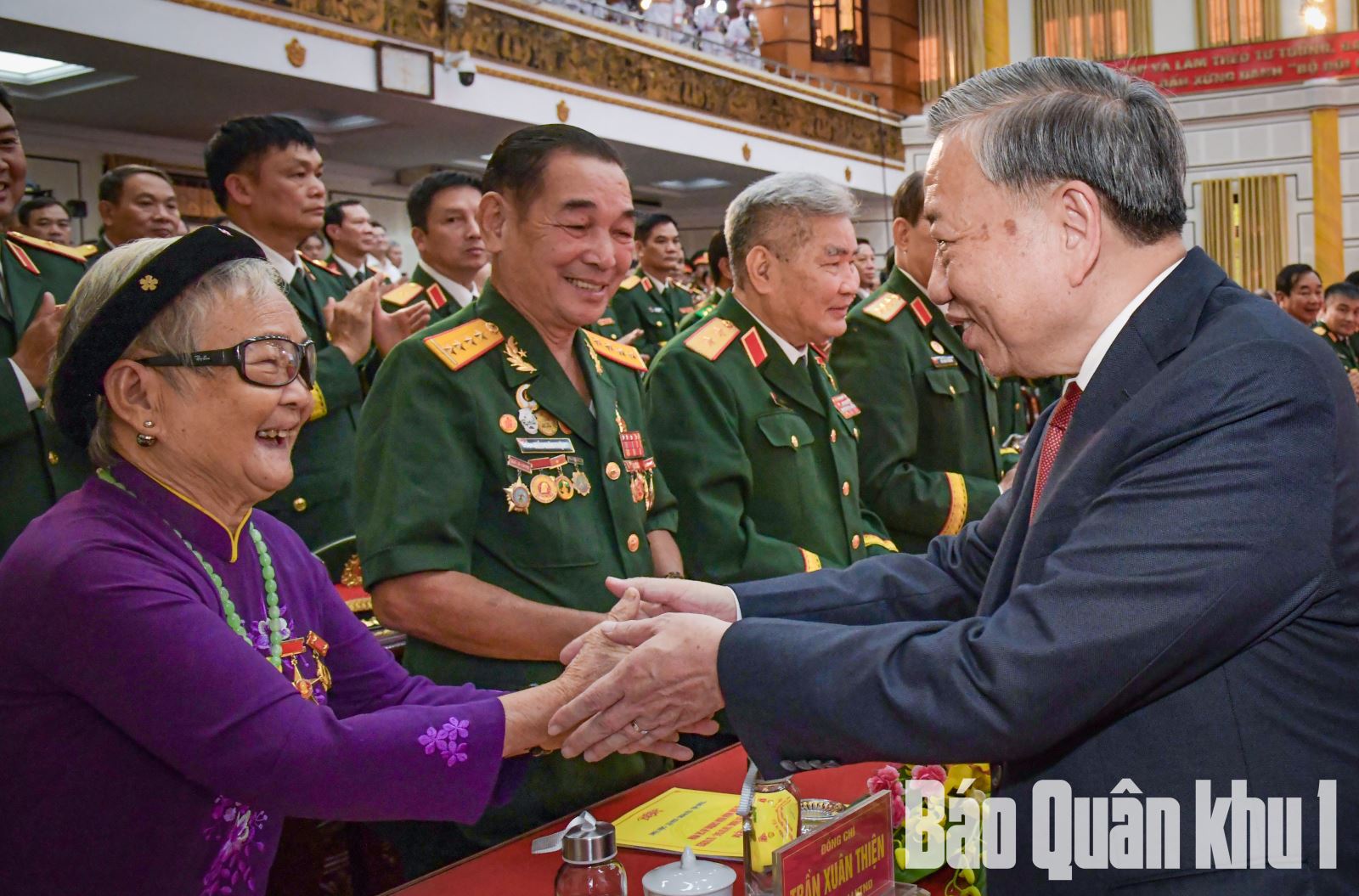 Tổng Bí thư Tô Lâm, Bí thư Quân ủy Trung ương chúc mừng các Anh hùng LLVT nhân dân, các đồng chí tướng lĩnh của LLVT Quân khu 1. Ảnh: BÙI HIỆP