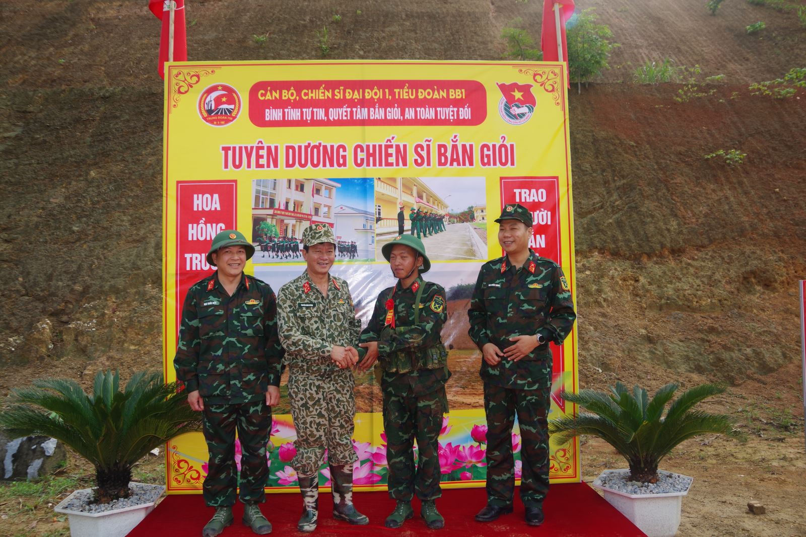 Thủ trưởng Bộ CHQS tỉnh Bắc Kạn tặng hoa bắn giỏi cho chiến sĩ mới.