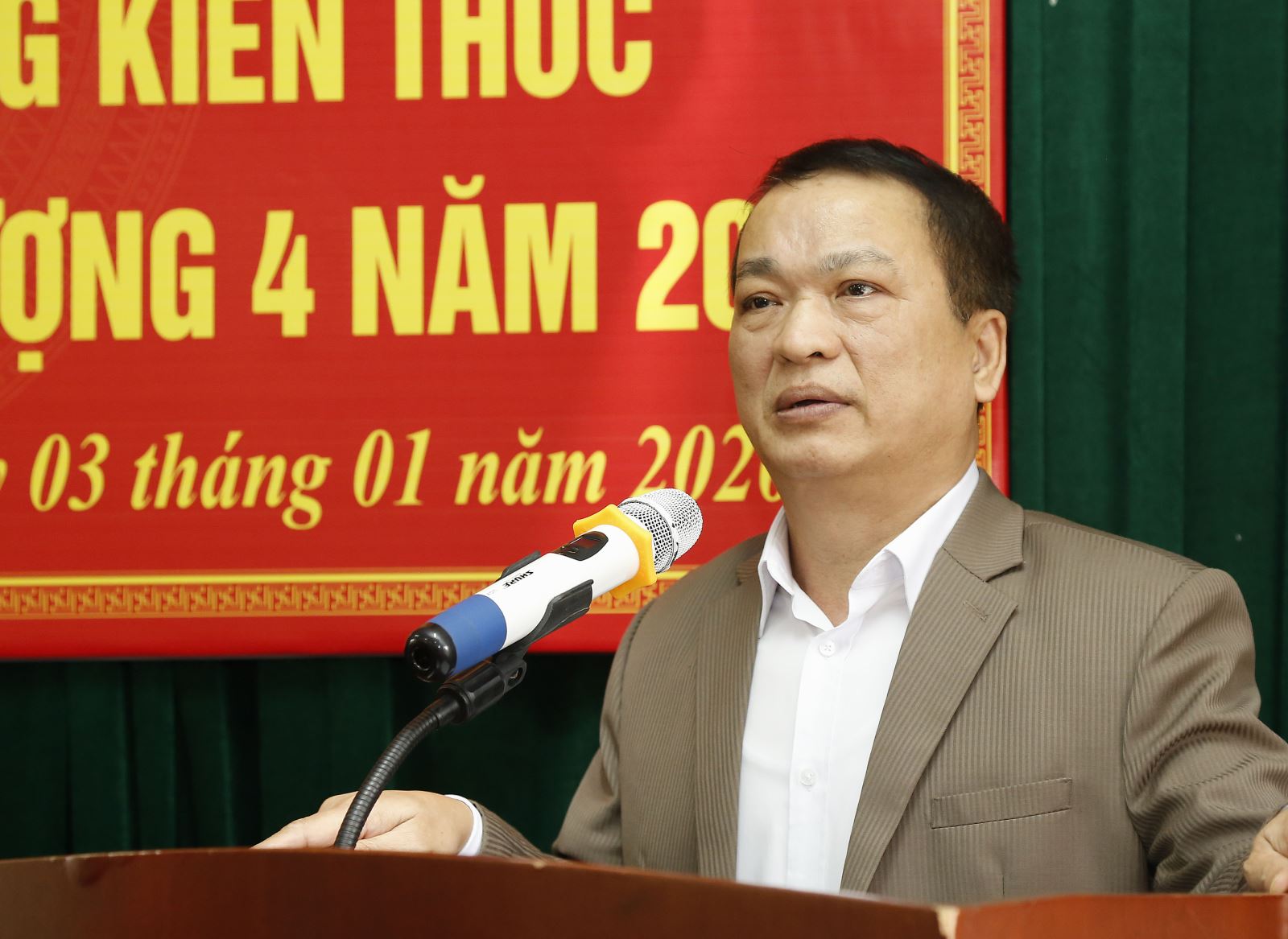 Đại tá Đinh Văn Long, Phó giám đốc Trung tâm giáo dục QPAN trình bày báo cáo sơ kết công tác bồi dưỡng kiến thức QPAN đối tượng 4.