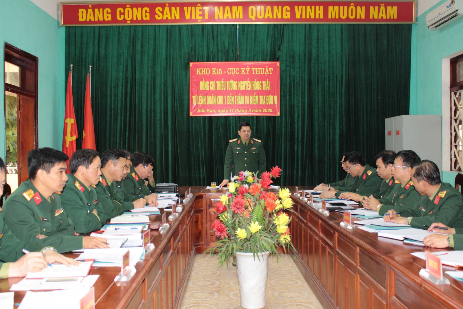 Qua nghe báo cáo và kiểm tra thực tế tại Kho K15, Thiếu tướng Nguyễn Hồng Thái ghi nhận, đánh giá cao kết quả thực hiện nhiệm vụ của đơn vị trong năm 2019 và quý 1-2020, nhất là việc xây dựng nền nếp chính quy, quản lý, bảo quản vũ khí, khí tài. Đồng thời yêu cầu trong thời gian tới, cán bộ, nhân viên, chiến sĩ tiếp tục phát huy trách nhiệm trong bảo quản, bảo dưỡng VKTBKT; chuẩn bị chu đáo và tổ chức thành công đại hội đảng; chú trọng đẩy mạnh tăng gia sản xuất cải thiện đời sống; duy trì nghiêm công tác tuần tra canh gác, luyện tập các phương án phòng chống cháy nổ, bảo vệ an toàn kho tàng; phối hợp chặt chẽ với cấp ủy, chính quyền địa phương nắm chắc tình hình địa bàn, xây dựng vành đai an toàn; chủ động xây dựng và hoàn thiện phương án SSCĐ phù hợp với tính chất đặc thù của kho kỹ thuật, không để bị động, bất ngờ trong mọi tình huống.