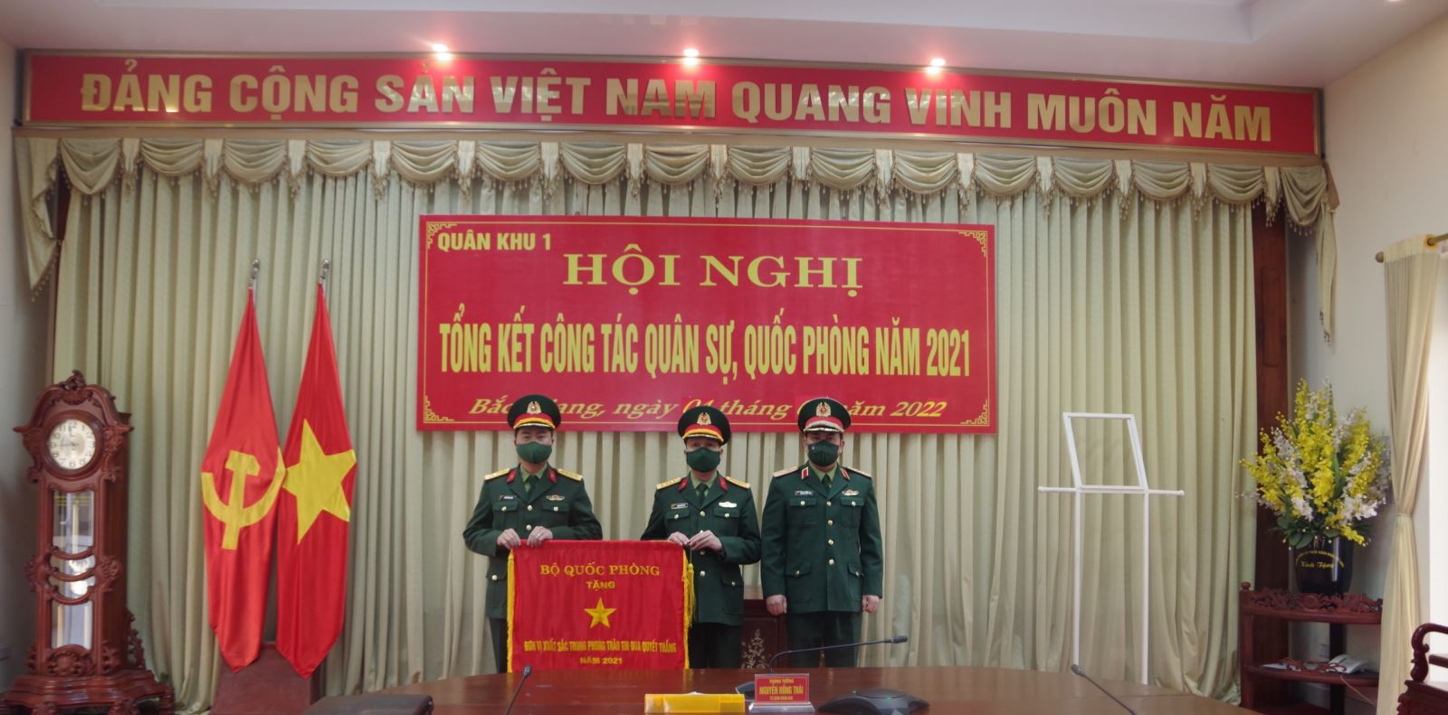 Cũng tại buổi làm việc, thừa ủy quyền của Bộ Quốc phòng, đồng chí Tư lệnh Quân khu đã trao Cờ thi đua của Bộ Quốc phòng tặng Sư đoàn 3 vì đã có thành tích xuất sắc trong thực hiện phong trào thi đua quyết thắng năm 2021.