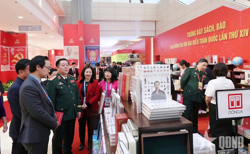 Đại tướng Nguyễn Trọng Nghĩa và đại biểu tham quan trưng bày sách, báo chào mừng Đại hội XIV của Đảng.