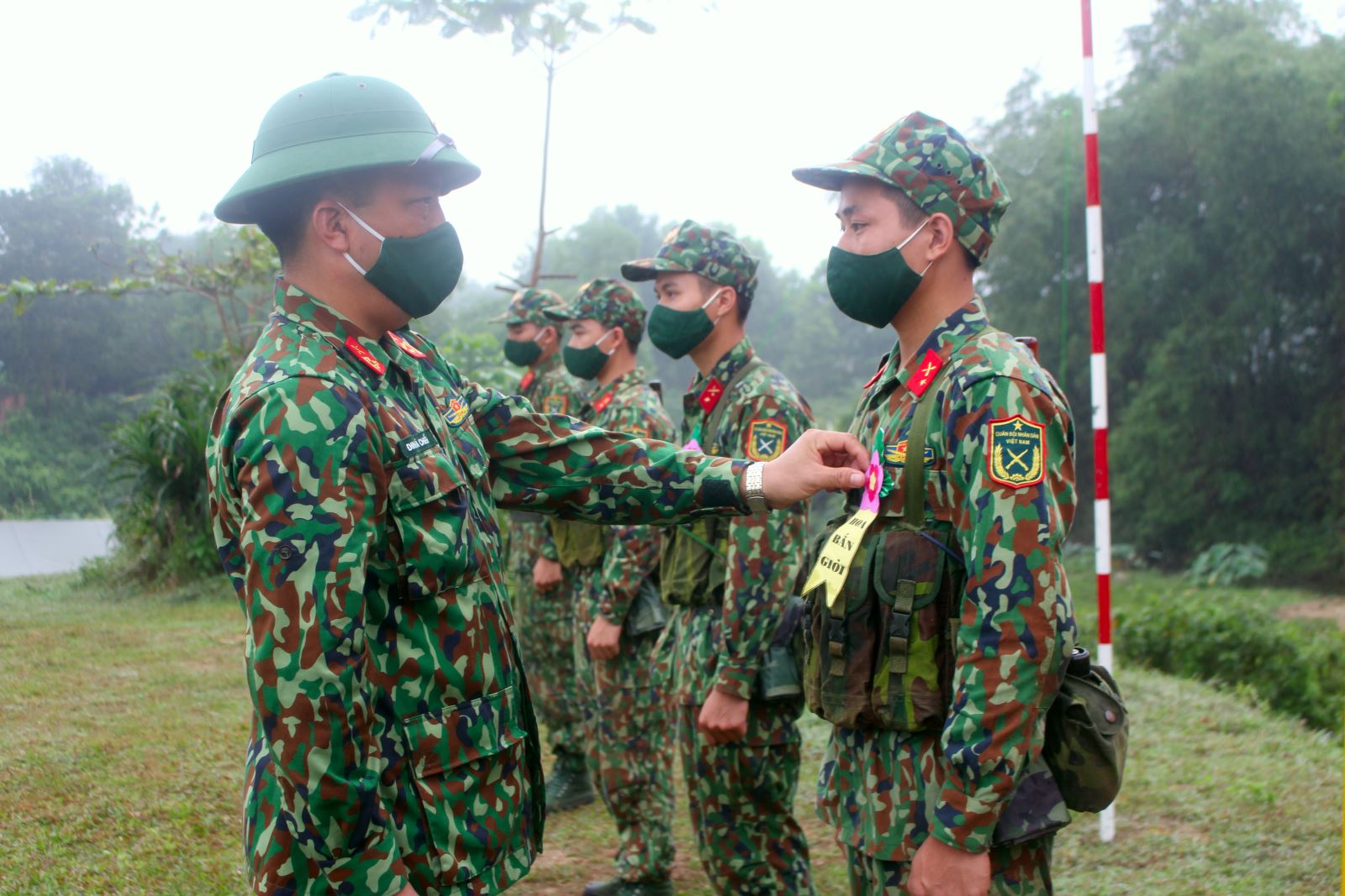 Thượng tá Đinh Bá Chiến, Phó lữ đoàn trưởng, Tham mưu trưởng Lữ đoàn Pháo binh 382 trao hoa bắn giỏi cho Binh nhì Lương Văn Đẹp.