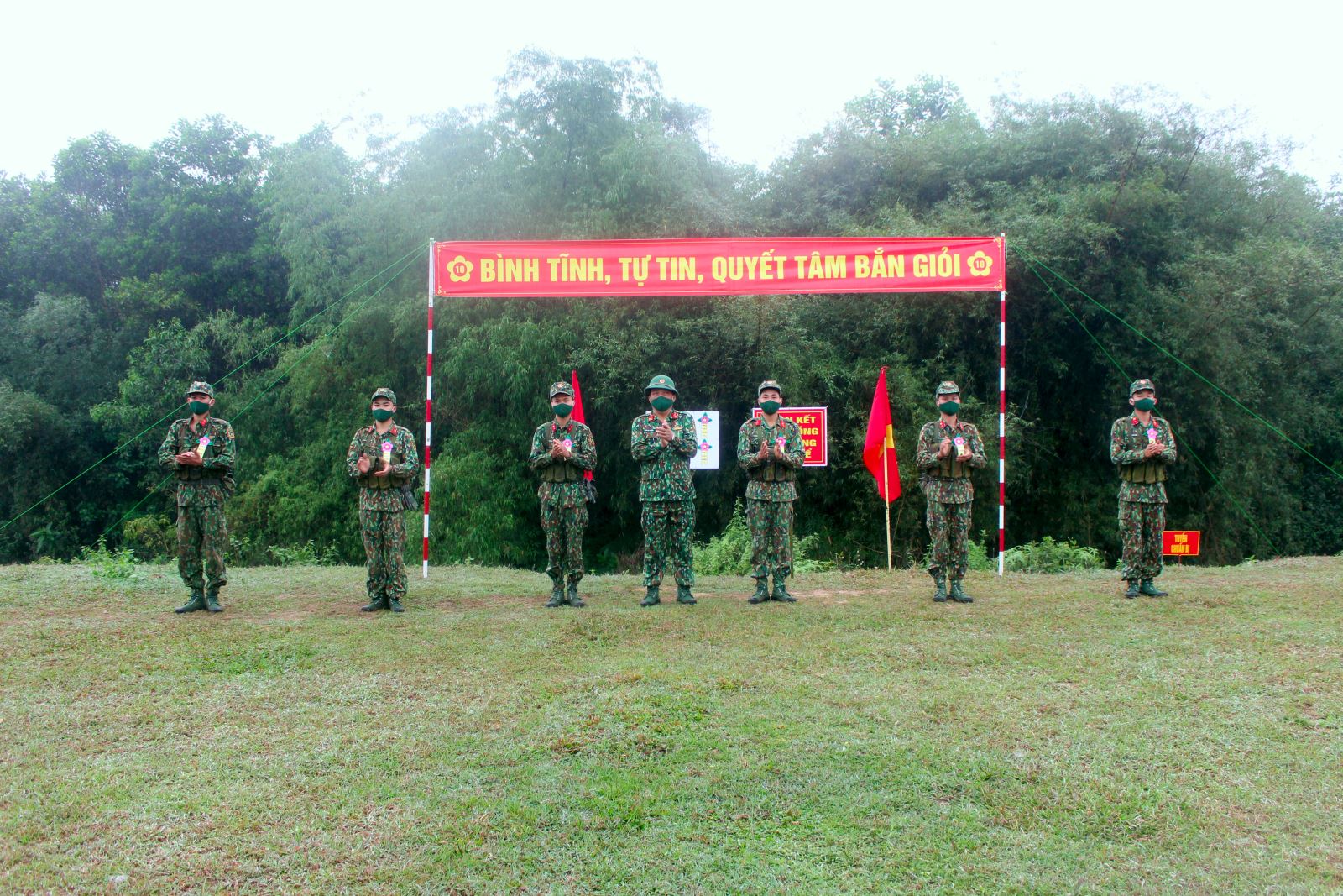 Binh nhì Lương Văn Đẹp (thứ 3 từ bên phải sang) được chỉ huy đơn vị tặng hoa bắn giỏi.