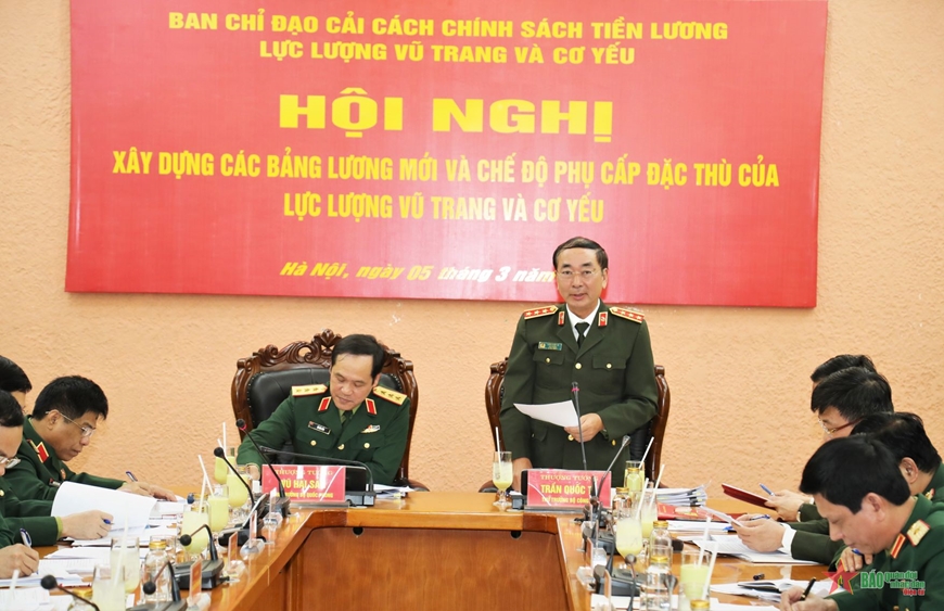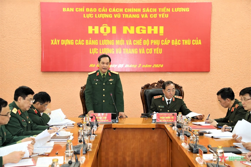 Thượng tướng Vũ Hải Sản, Ủy viên Trung ương Đảng, Thứ trưởng Bộ Quốc phòng, Trưởng ban chỉ đạo Cải cách chính sách tiền lương lực lượng vũ trang và cơ yếu, chủ trì Hội nghị. Thượng tướng Trần Quốc Tỏ, Ủy viên Trung ương Đảng, Phó bí thư Đảng ủy Công an Trung ương, Thứ trưởng Bộ Công an, Phó trưởng ban thường trực Chỉ đạo Cải cách chính sách tiền lương lực lượng vũ trang và cơ yếu, đồng chủ trì Hội nghị.